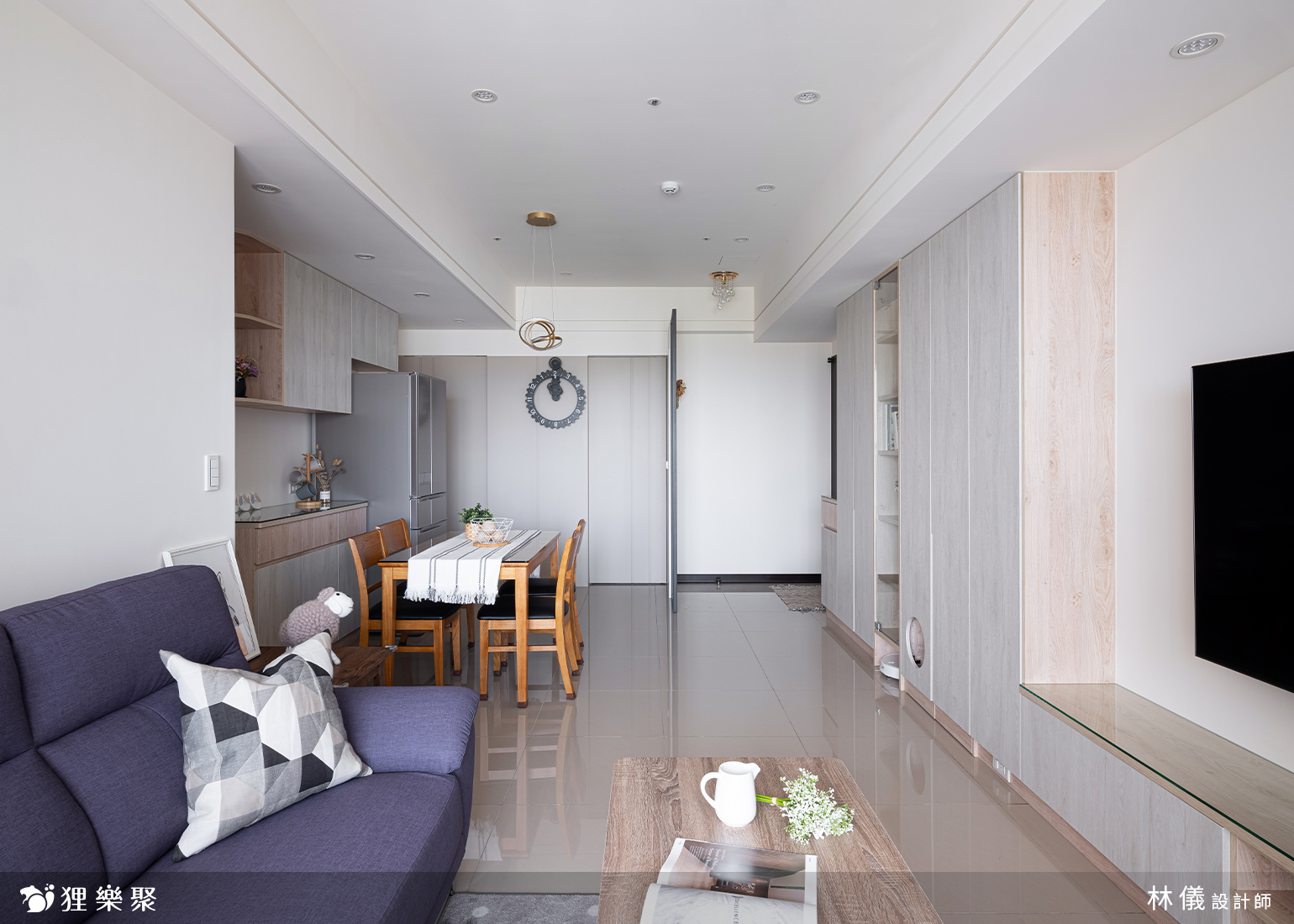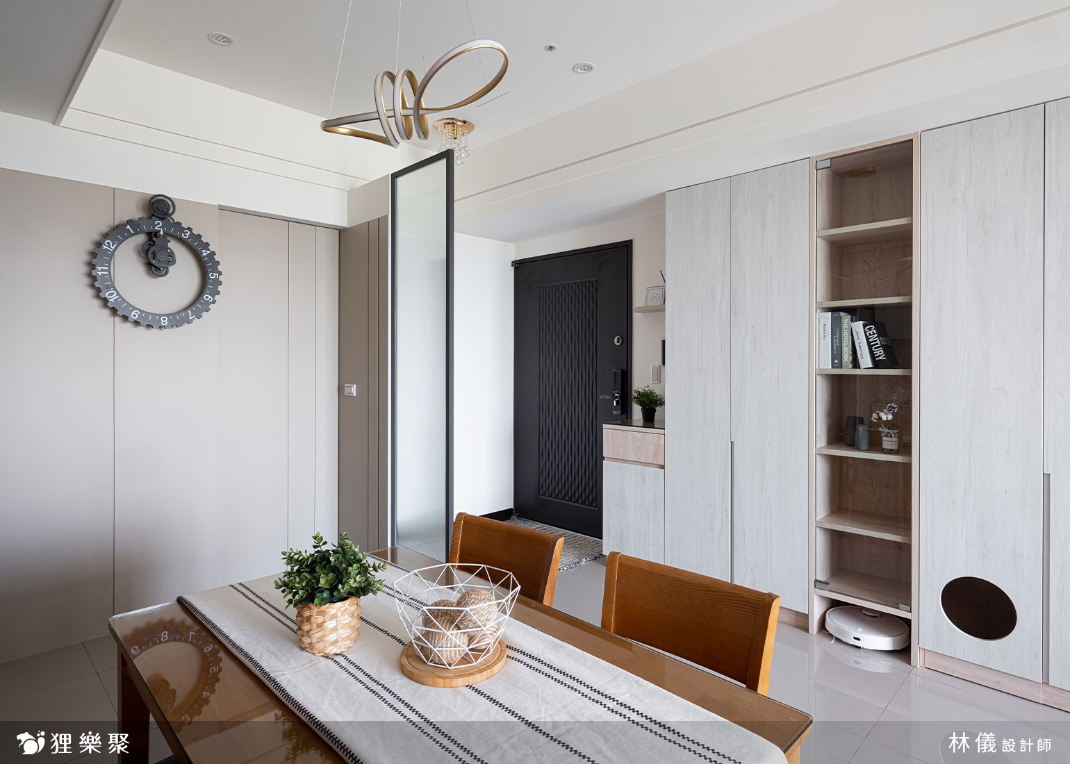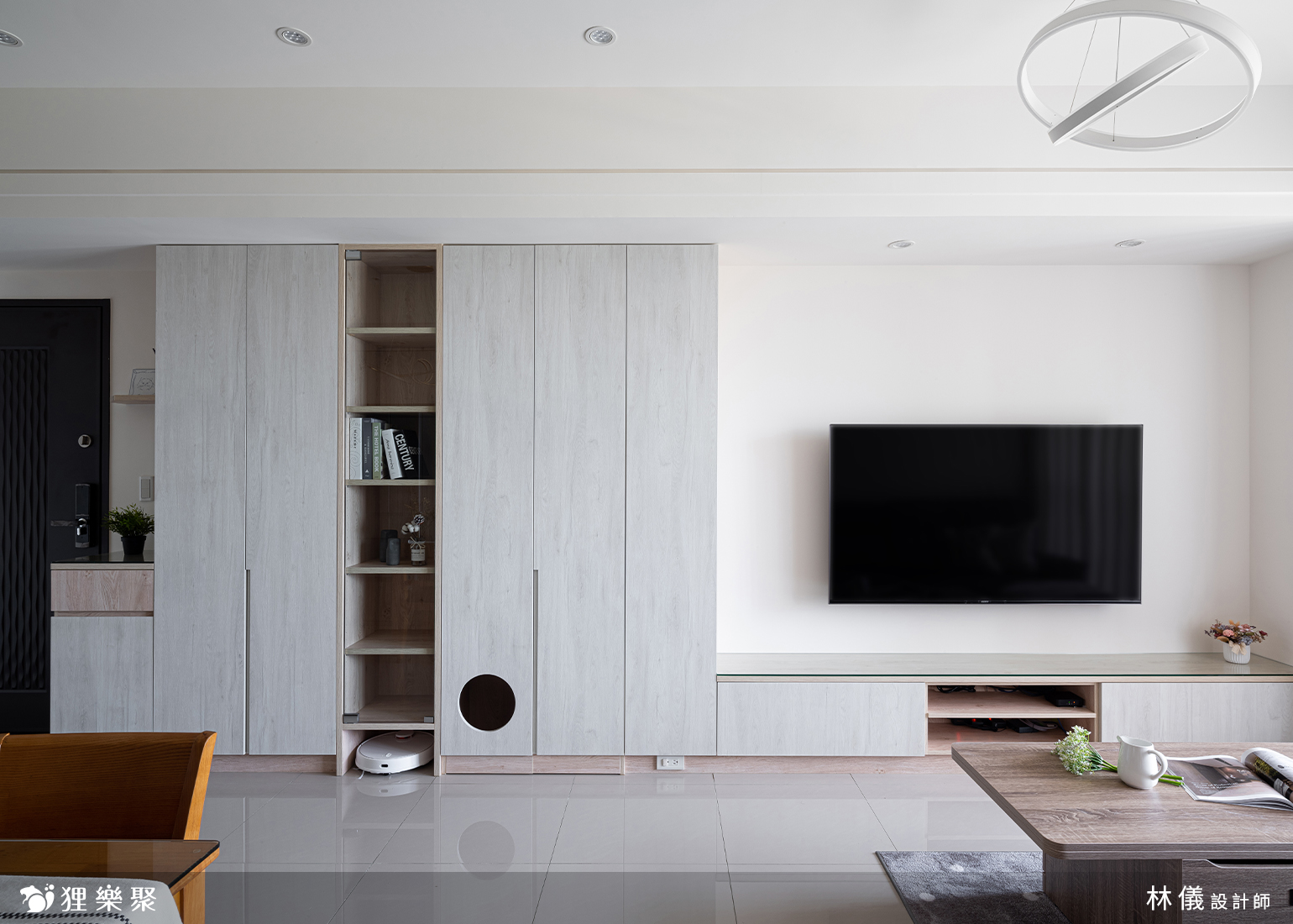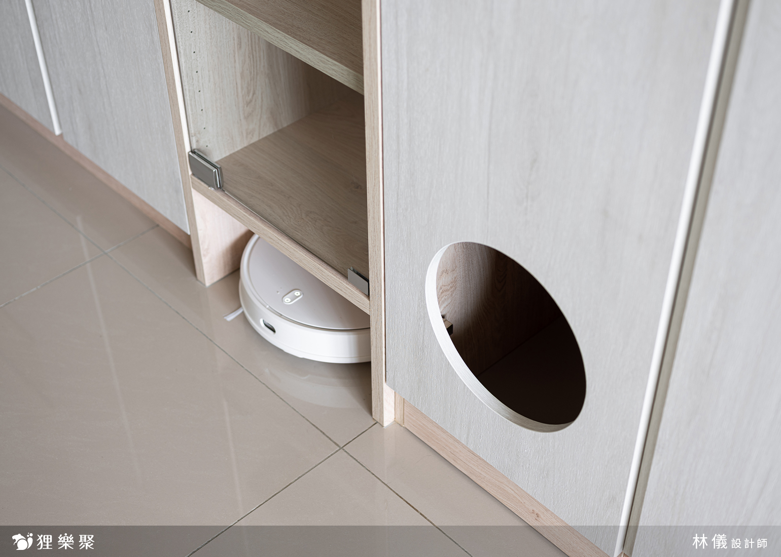系統櫃是小坪數裝潢的一大助力,比起現成家具的固定尺寸,系統櫃能夠依照屋主的想法量身訂做,並為不同寬度的牆、不同高度的樑打造專屬於這個空間的櫃子,最大化收納空間之餘,頂天的櫃體也省去了清掃的功夫,另外還有低甲醛、粉塵少、組裝快速等優點。全室使用系統櫃設計收納櫃體,在公共區域只利用少部分的開放櫃來做變化,並提供屋主足量的展示需求,其餘櫃體皆搭配門片,降低灰塵進入的機會;除此之外,也可以利用系統櫃設計寵物空間,門片下方的圓形挖孔可以讓寵物自由進出,提供家中的小成員大大的安全感。