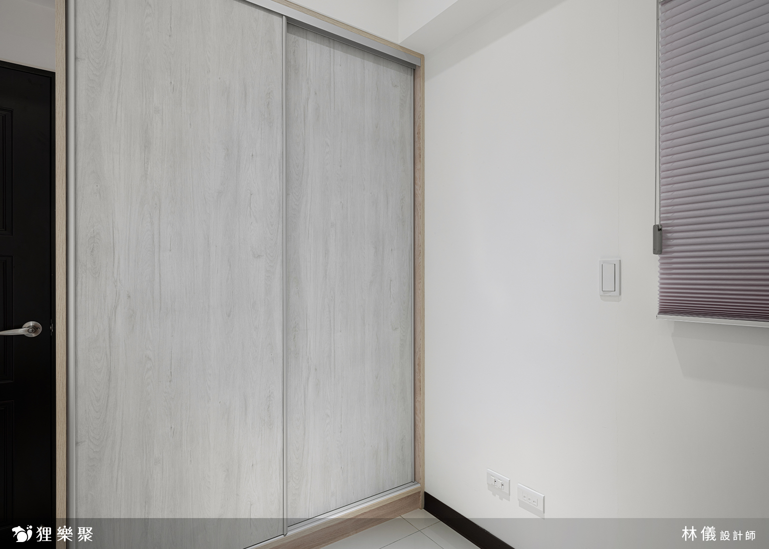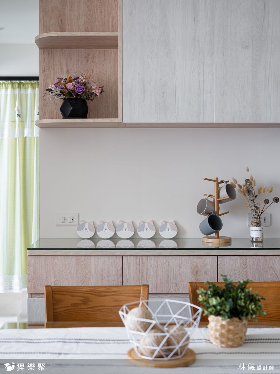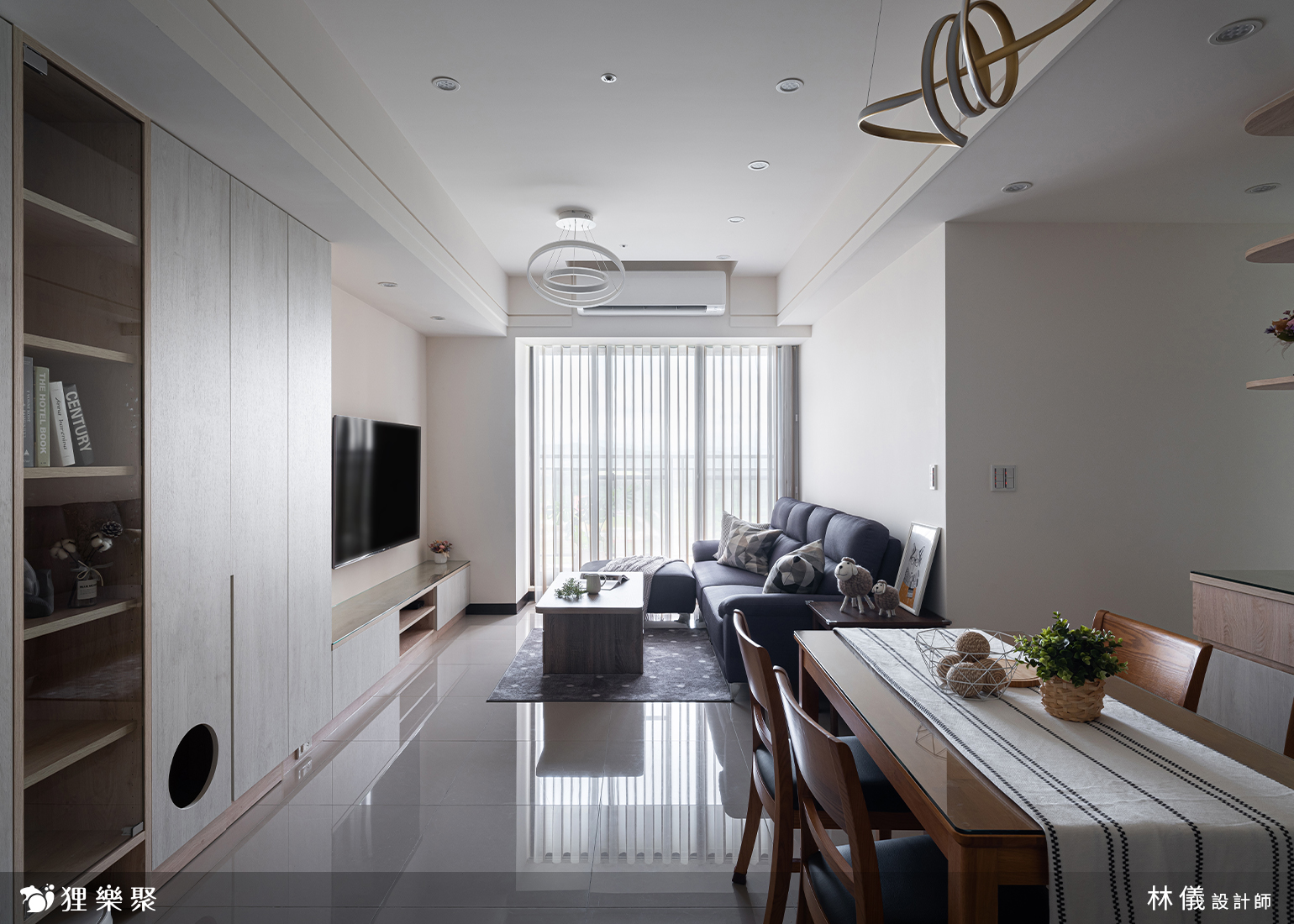 系統櫃是小坪數裝潢的一大助力,比起現成家具的固定尺寸,系統櫃能夠依照屋主的想法量身訂做,並為不同寬度的牆、不同高度的樑打造專屬於這個空間的櫃子,最大化收納空間之餘,頂天的櫃體也省去了清掃的功夫,另外還有低甲醛、粉塵少、組裝快速等優點。全室使用系統櫃設計收納櫃體,在公共區域只利用少部分的開放櫃來做變化,並提供屋主足量的展示需求,其餘櫃體皆搭配門片,降低灰塵進入的機會;除此之外,也可以利用系統櫃設計寵物空間,門片下方的圓形挖孔可以讓寵物自由進出,提供家中的小成員大大的安全感。