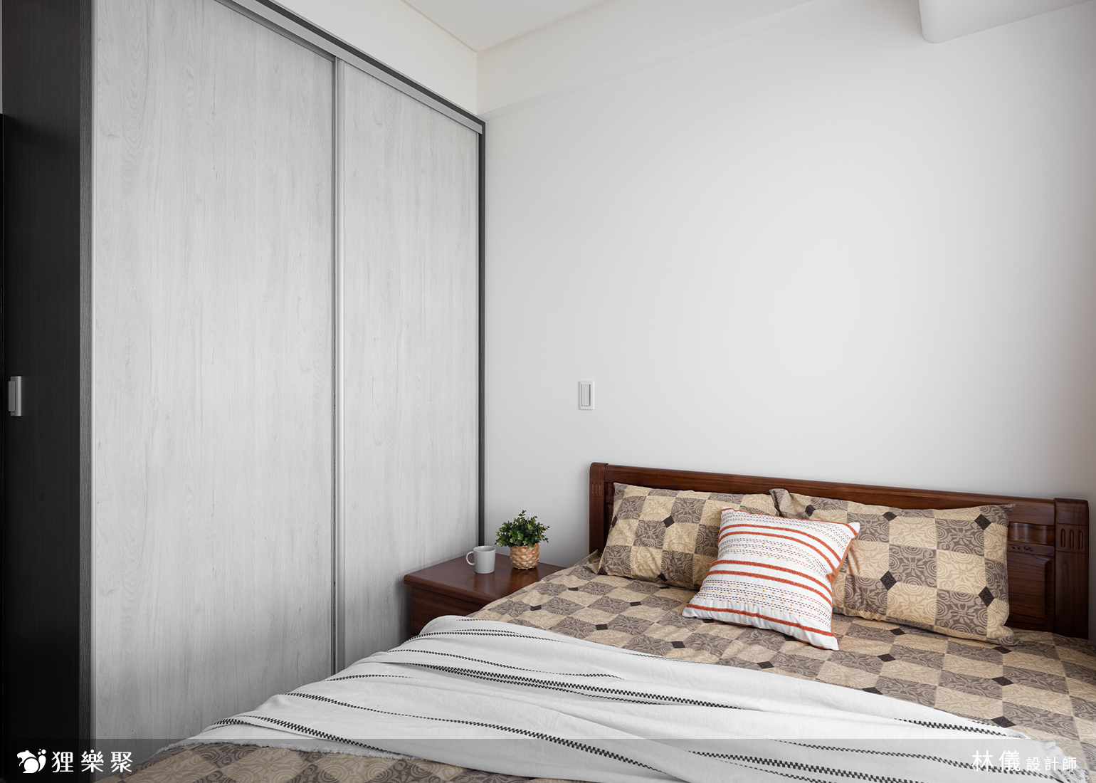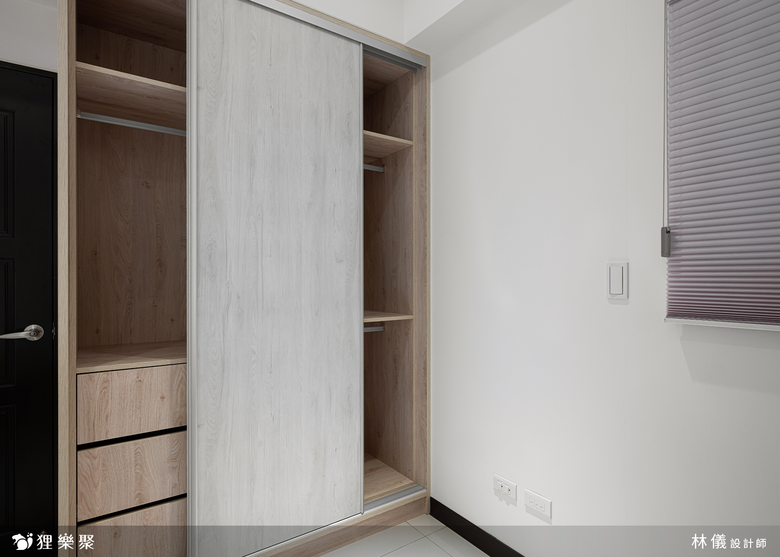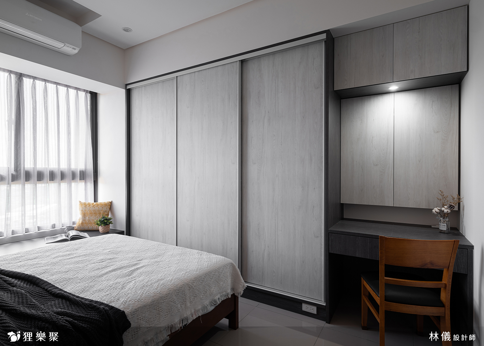 由於空間不足,小坪數房間設計建議使用推拉門衣櫃,讓出門片開關的空間,提高拿取衣物的便利性;而衣櫃結合化妝桌在小坪數房間設計也相當常見,將機能區域集中在一側,減輕視覺的負擔,即使空間不大也不會造成壓迫感。