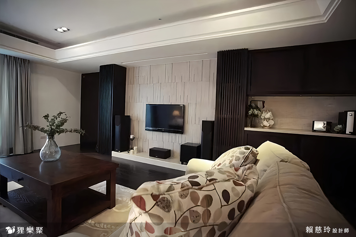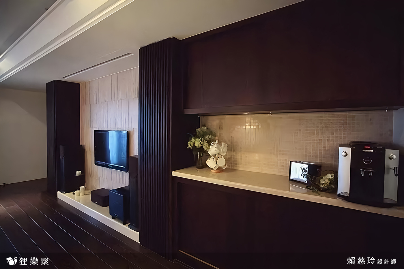 屋主喜歡深色調的居家風格,並且非常喜愛看電影,在空間設計上以暗色木頭搭配黑色,打造出有如影廳般的氛圍。大面積的深色能夠營造沉穩的空間感受,是現今少見的裝潢選擇,呈現出屋主獨樹一幟的風格品味。
