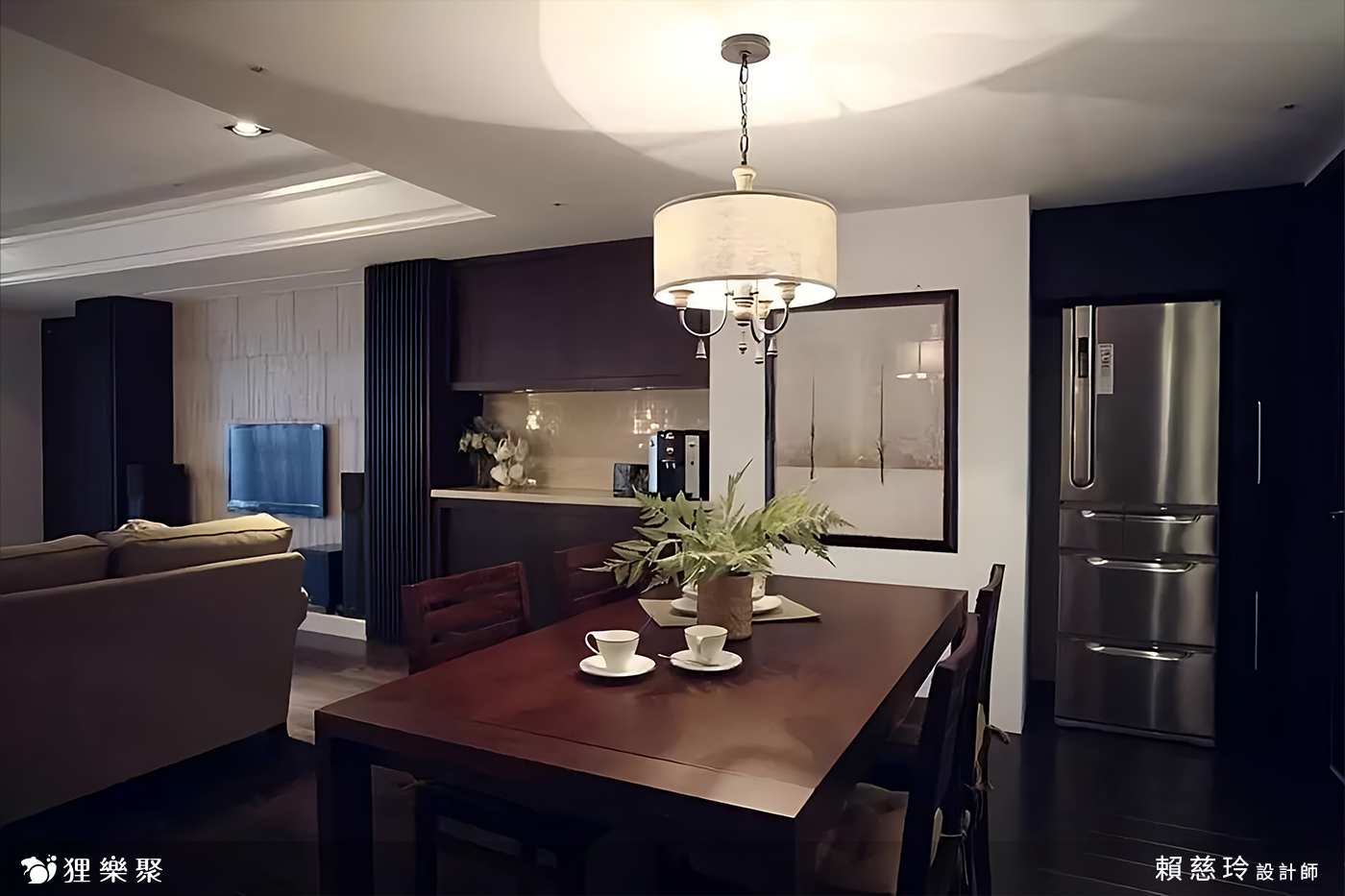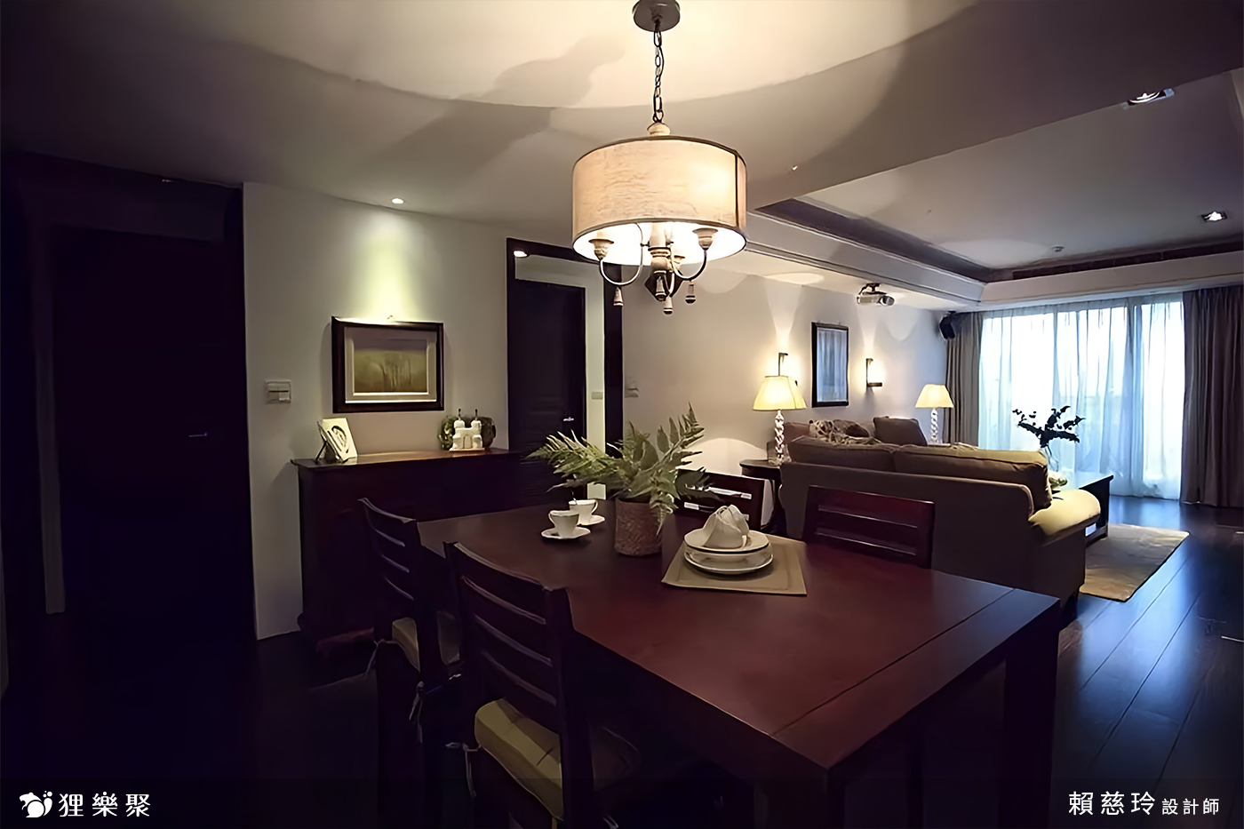 整個居家空間以深色系為主體,從地板、櫃體、茶几、餐桌、門片、到床架以及臥榻皆是,雖然能空間相當沉穩,但一不小心也容易顯得陰暗無趣,設計師利用燈光的營造來解決這個問題,透過不同的燈具造型、色溫、亮度,設置在家中的不同角落,讓空間隨著一盞盞燈的點亮而溫馨起來。