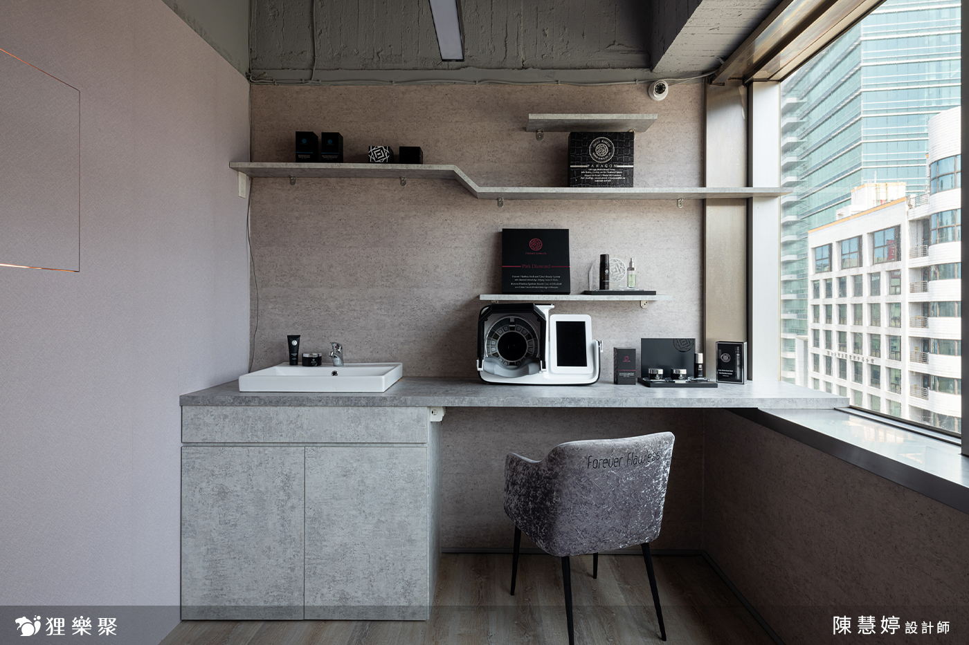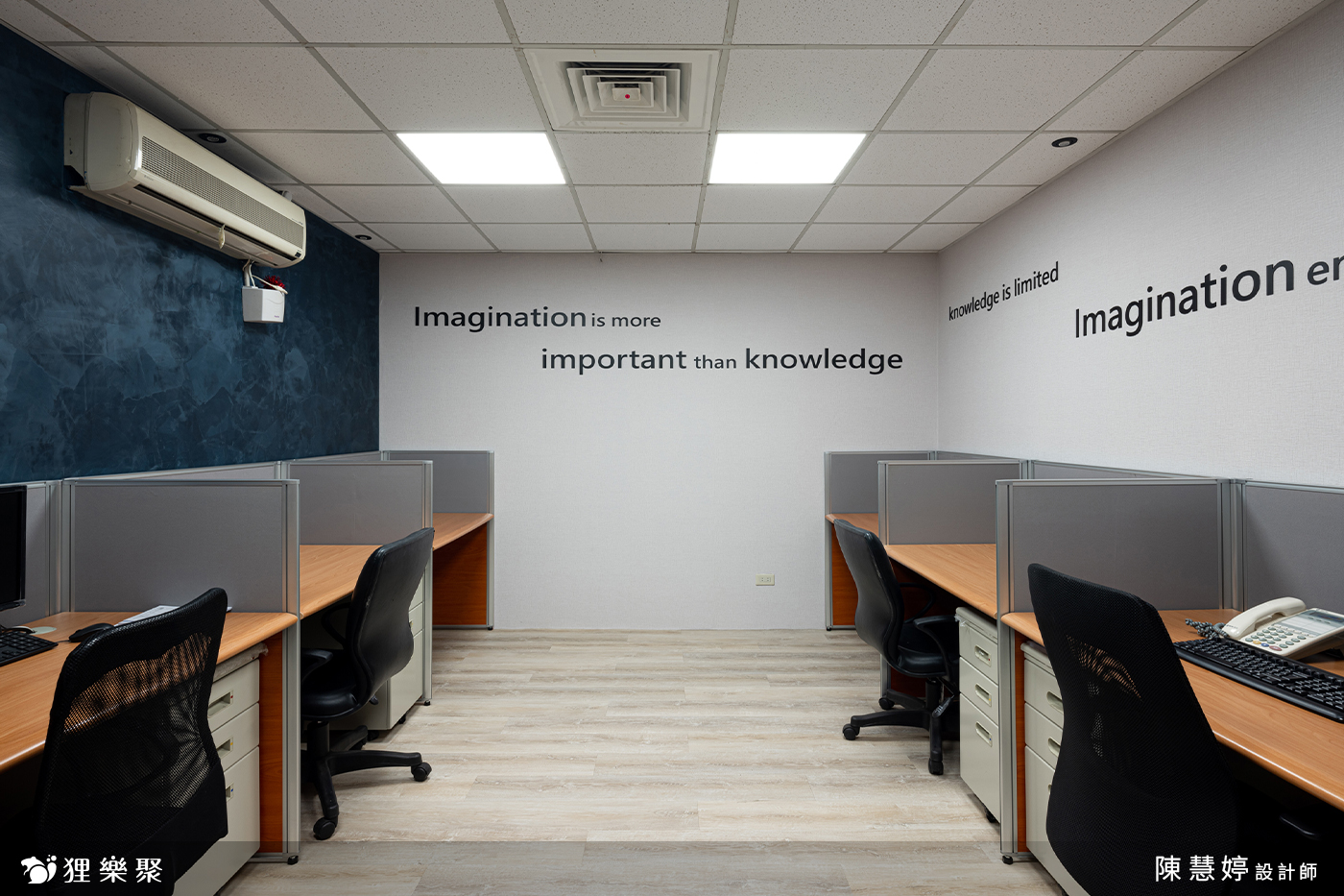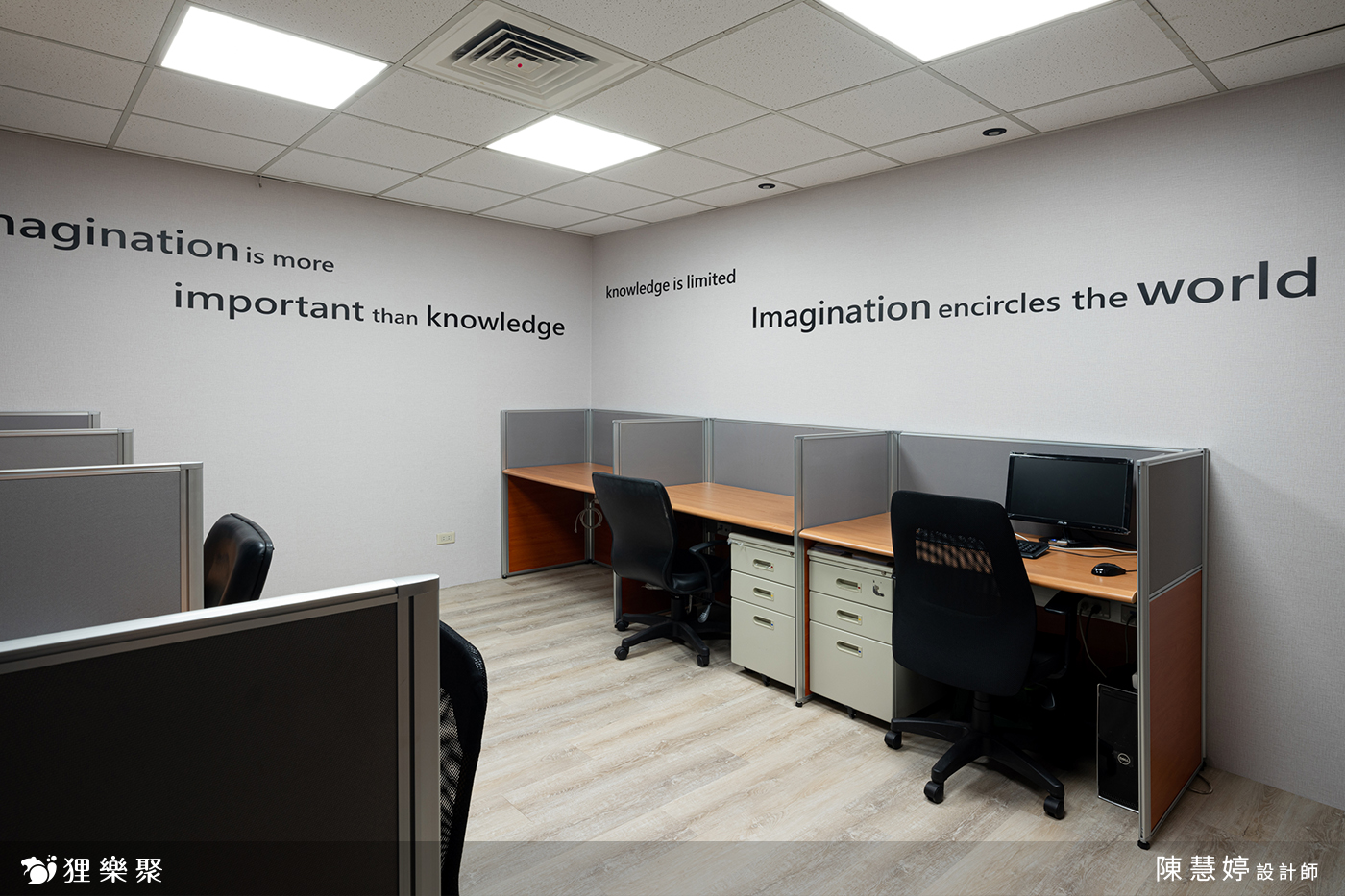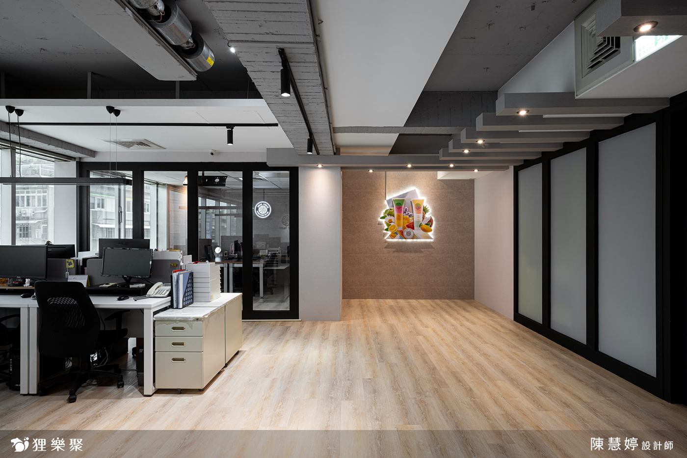 這次為化妝品公司打造新辦公室,並針對業主的需求,節省預算及規劃可以日後擴充人數的座位格局。同時也將LOGO的不規則意象的造型,帶入到入口牆面及地面做為視覺的開端,搭配一些激勵人心的標語裝飾在牆面,增加員工上班奮鬥的意志力。