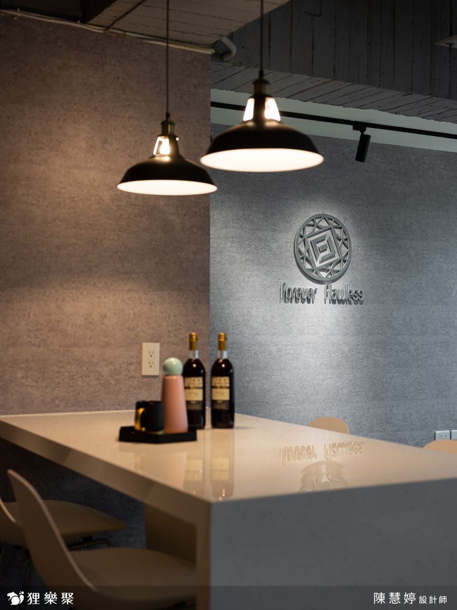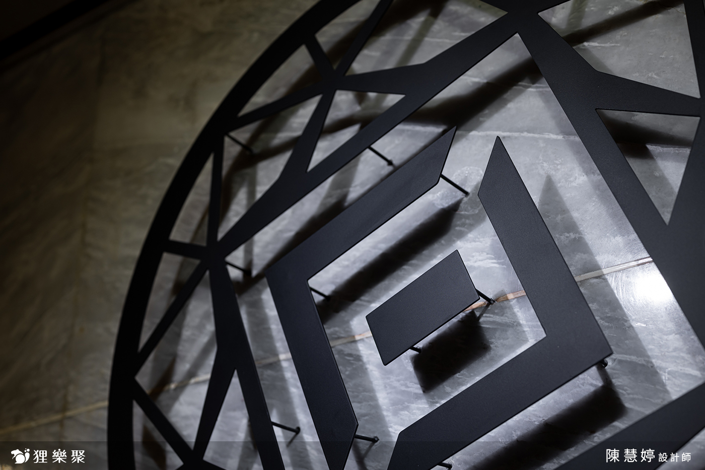 現代風常使用基本的黑白灰色調來打造簡約大氣的感受,再搭配上局部的水泥、石紋為空間定調;純白色的吧檯桌椅是員工休憩、溝通的好場所,顯眼的主牆利用石材紋路展現低調奢華感,掛上以幾何圖形為元素的鐵件Logo,帶出現代風格的高質感。
