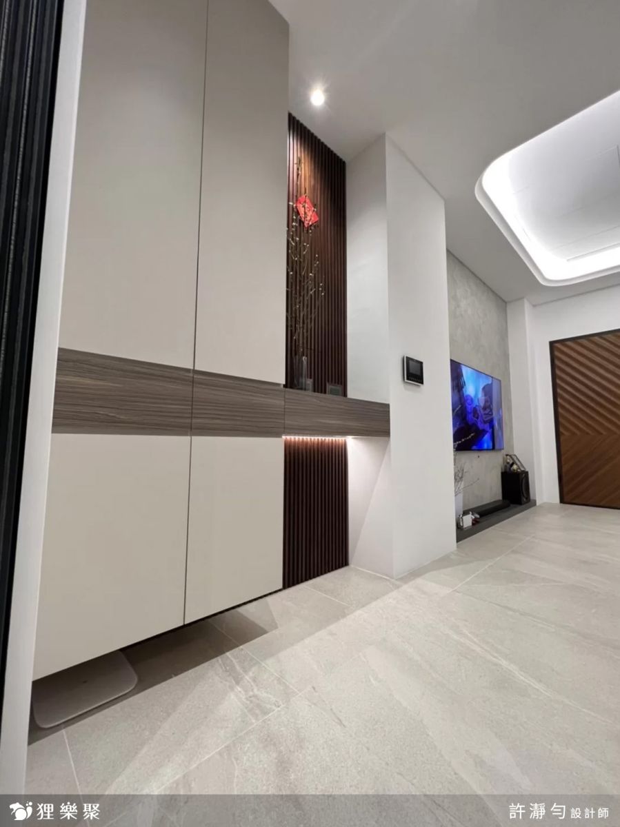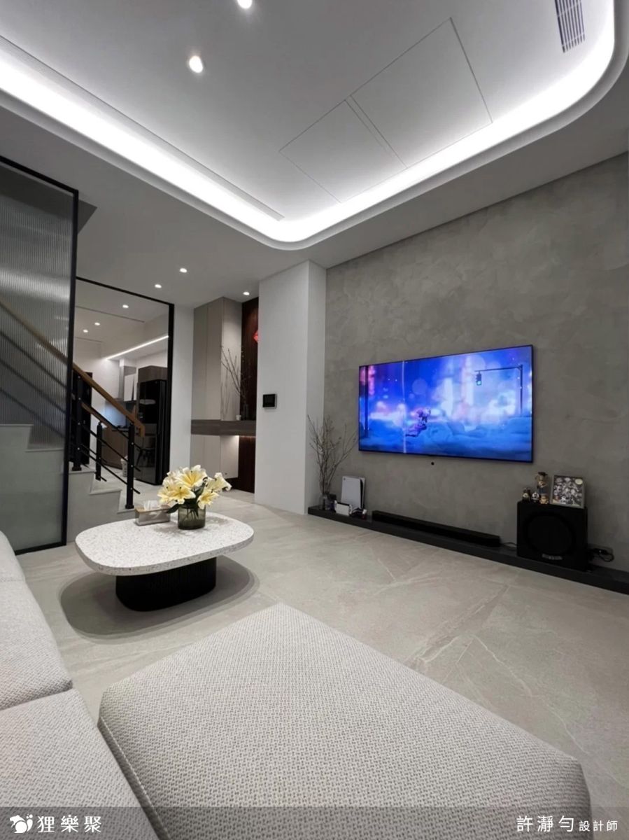 屋主喜歡韓劇中簡潔明亮的氛圍,因此空間要重新分配,設計師將客廳、餐廳、廚房整合,廚房動線規劃成L型,使掌廚者下廚時能依循冰箱、備料、烹飪的順暢動線,並用電視牆掩蓋樓梯,創造出清爽的公領域,也兼顧隱私。