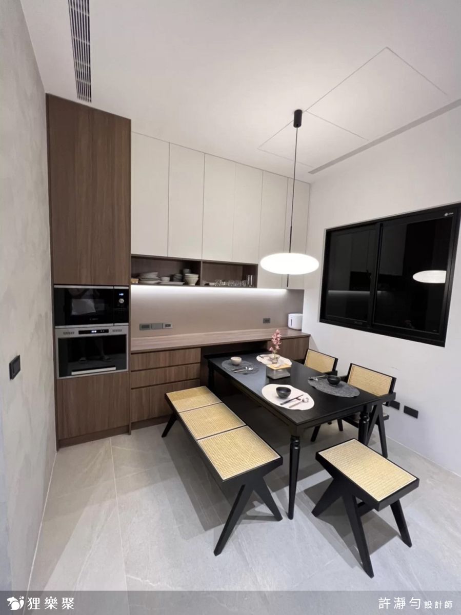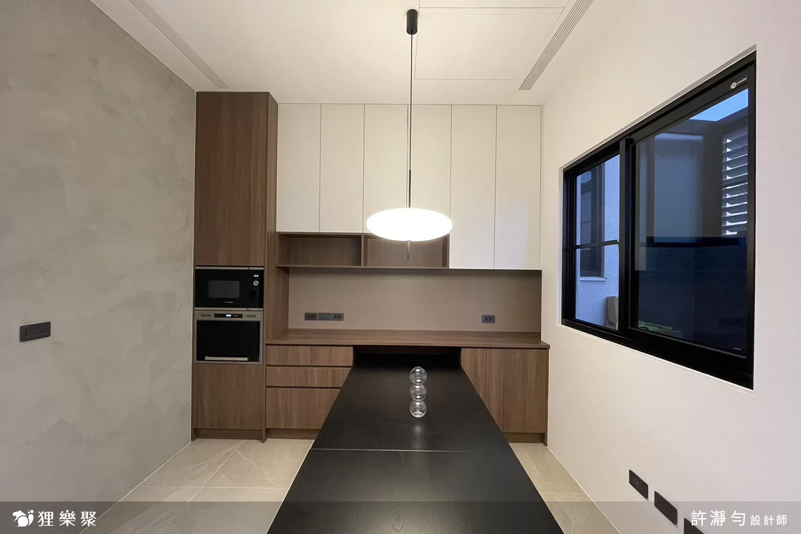 簡潔的電視牆設計以及寬闊的L型沙發,能夠容納一家人在客廳談天交流;開放式廚房與餐廳規劃了長桌與海量的收納空間加上電器櫃,不僅兼顧下廚的機能、動線的順暢,也能讓掌廚者下廚時與家人互動,保持舒適愉快的心情。