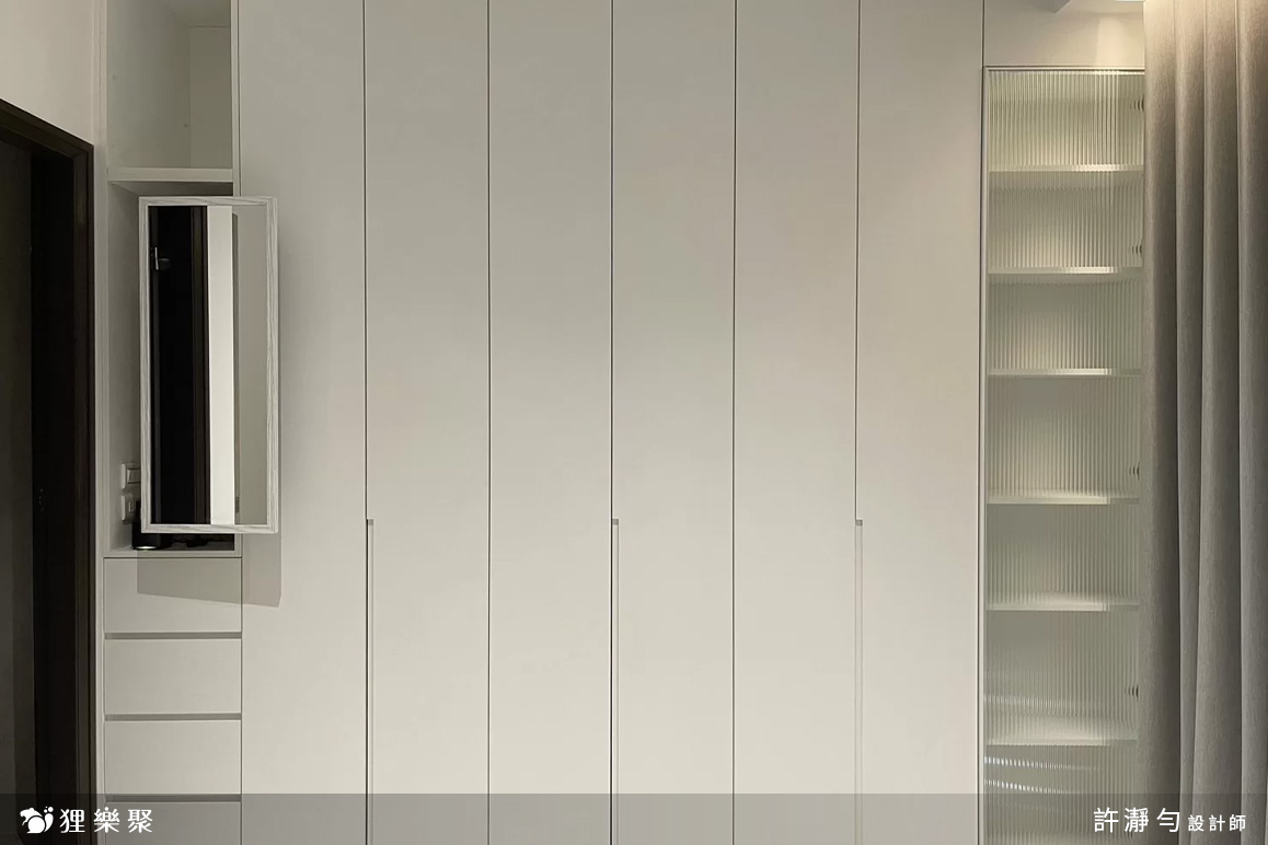 於私領域最重視的是收納機能,室內設計師運用高低收納櫃兼顧化妝品與衣物配件的收納,而床尾處的衣櫃則搭配了一塊長虹玻璃的展示櫃,在收納機能以外,更多了一絲設計品味。