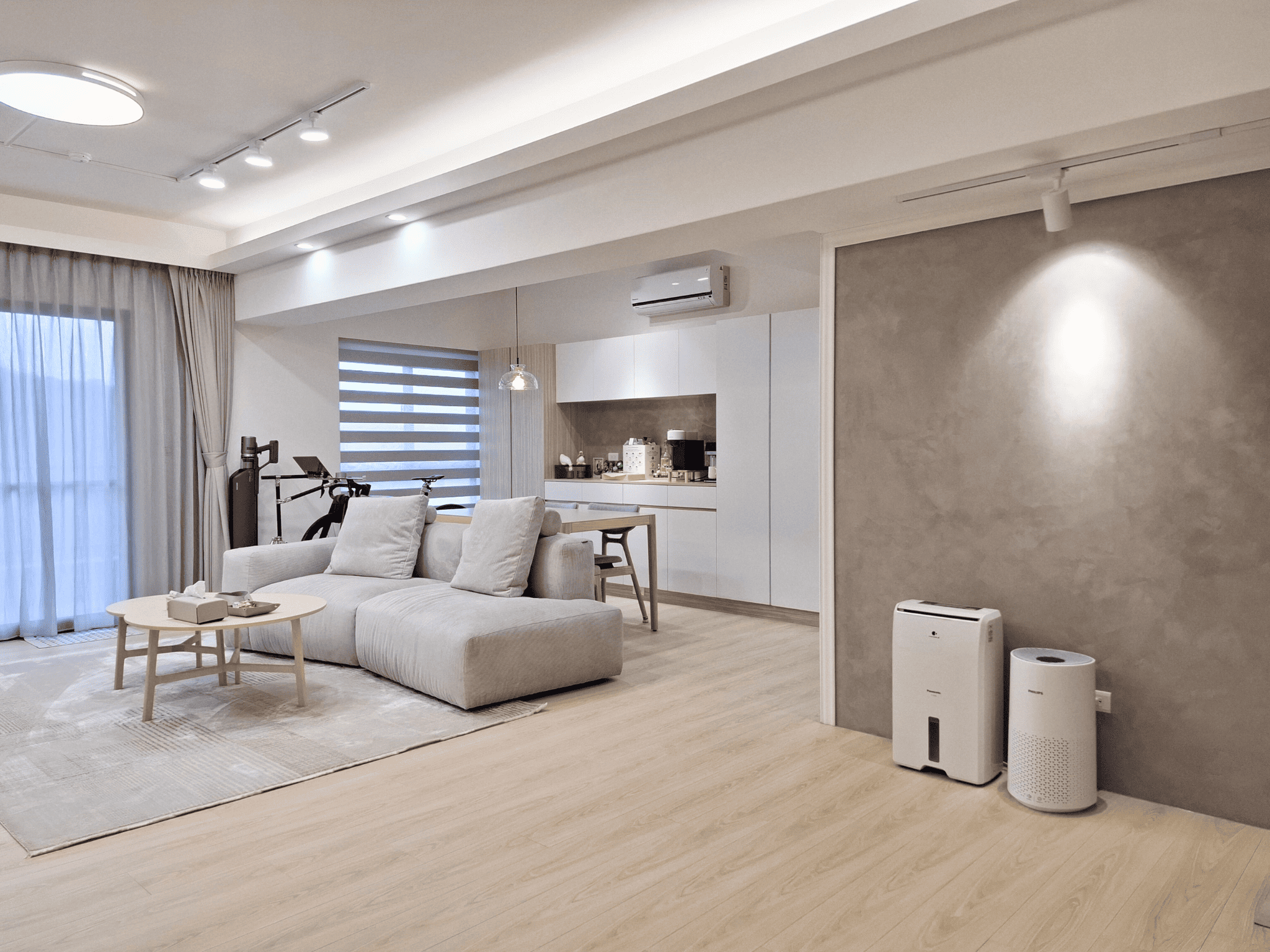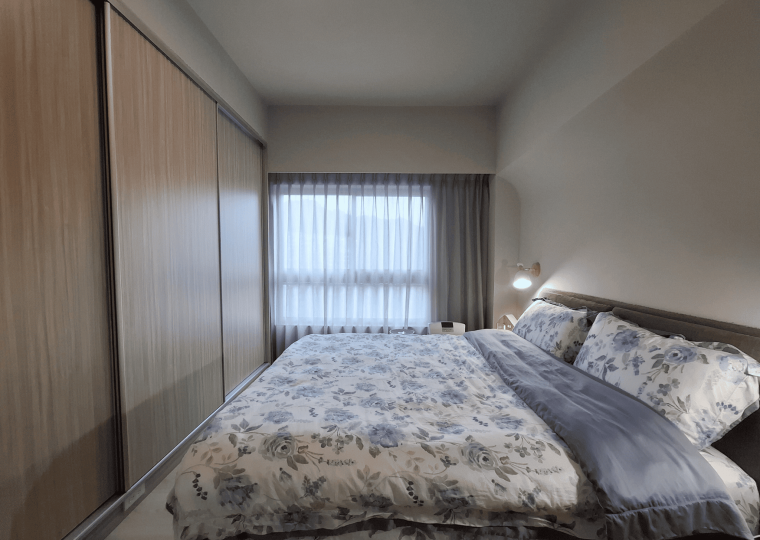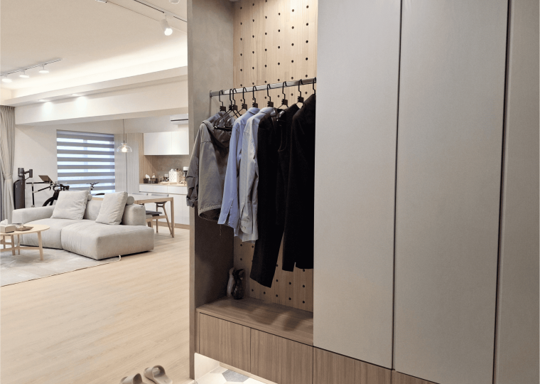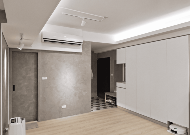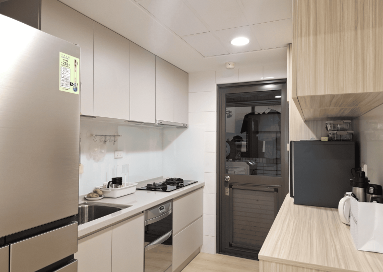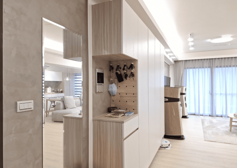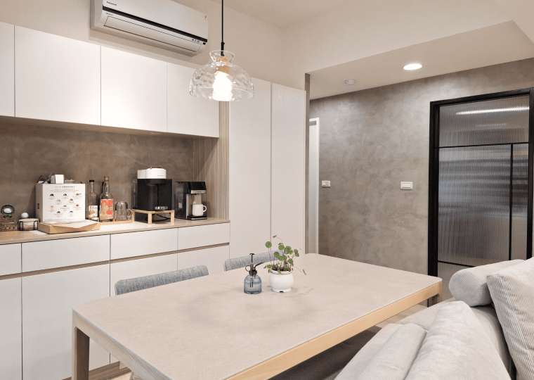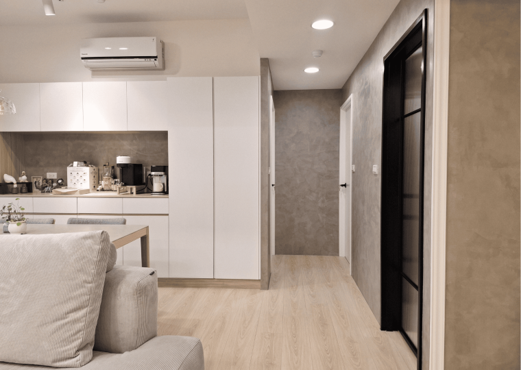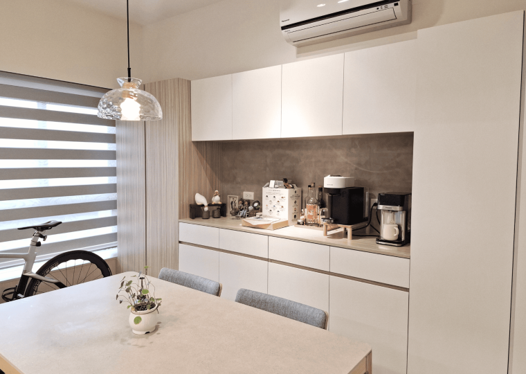 空間採現代簡約設計,整體以白色基調結合淺木紋材質,形塑出明亮清新的視覺印象。客餐廳採開放式格局,動線銜接自然,使空間更顯通透。地坪選用淺色木紋地板,延續整體風格一致性,搭配垂直面的大量收納櫃體,兼具美觀與機能。