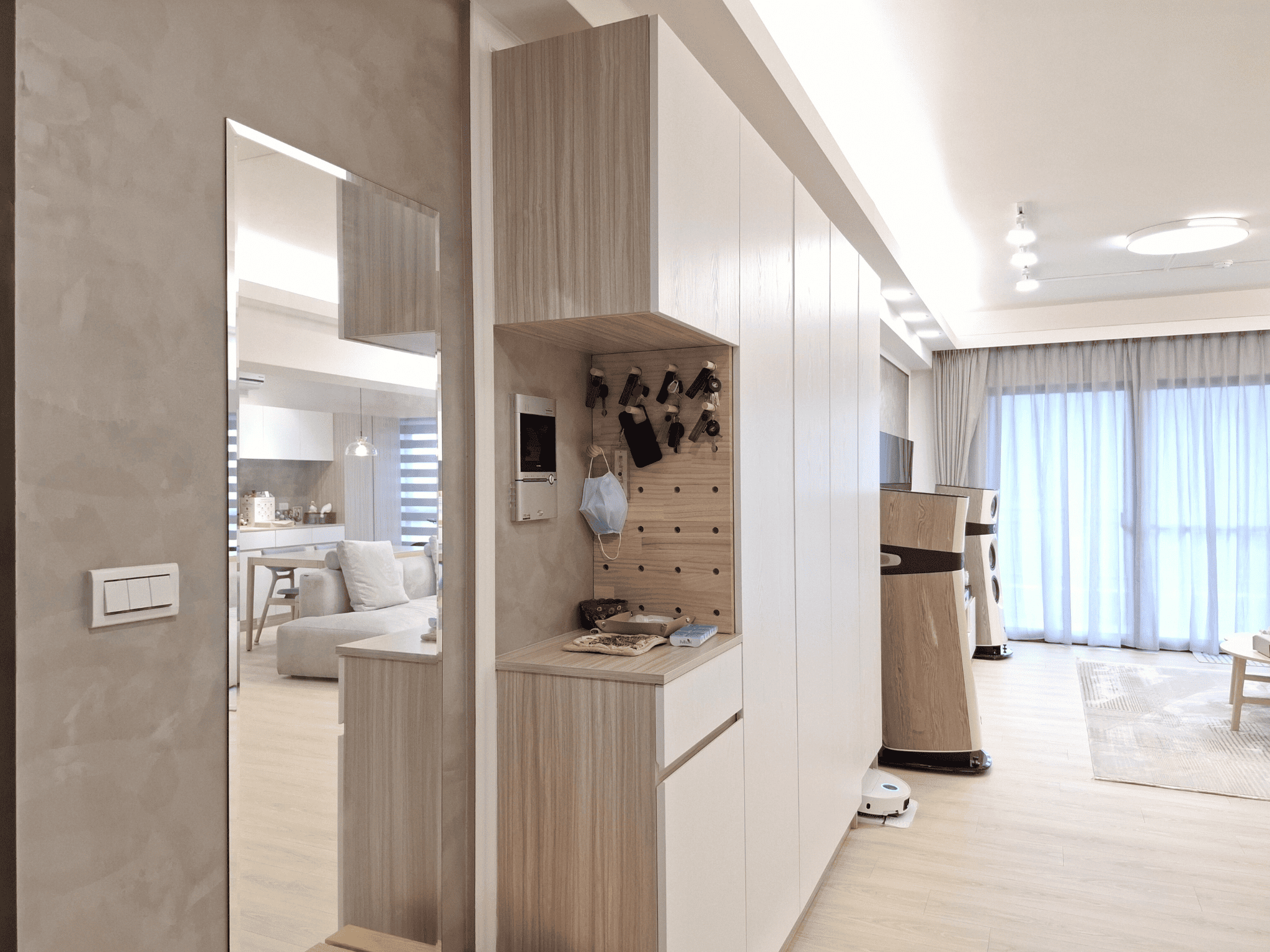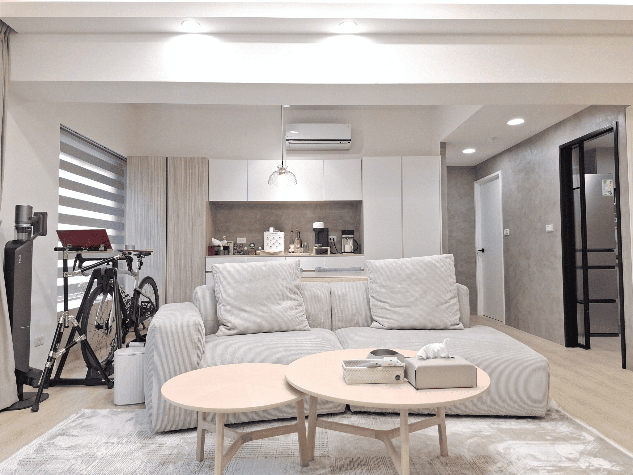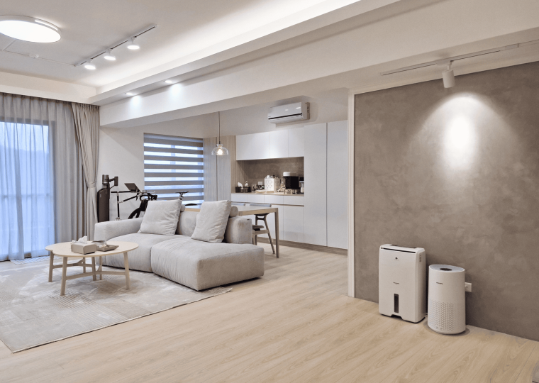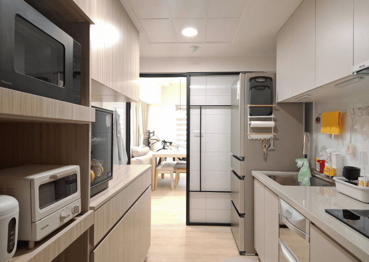 空間採現代簡約設計,整體以白色基調結合淺木紋材質,形塑出明亮清新的視覺印象。客餐廳採開放式格局,動線銜接自然,使空間更顯通透。地坪選用淺色木紋地板,延續整體風格一致性,搭配垂直面的大量收納櫃體,兼具美觀與機能。