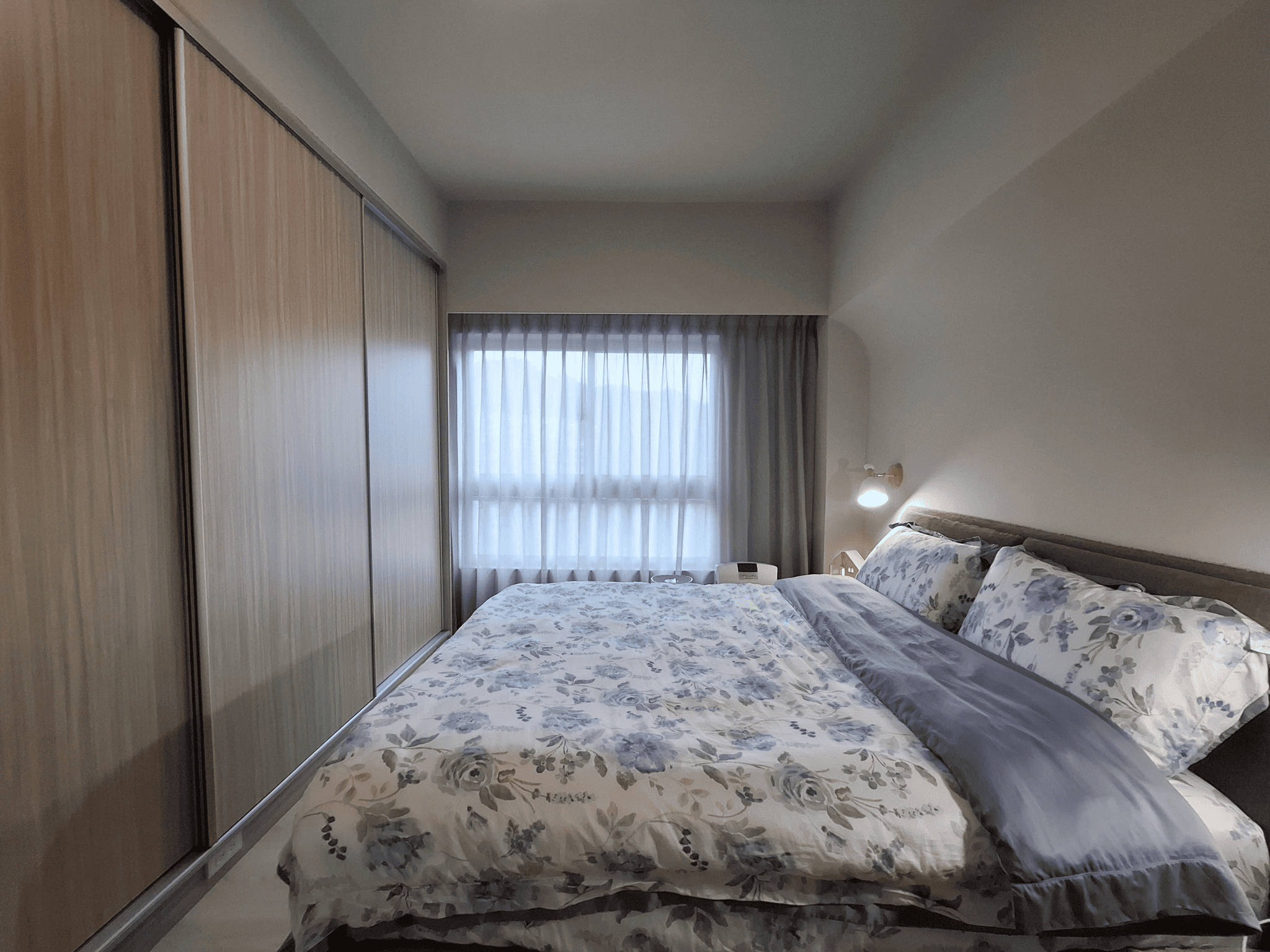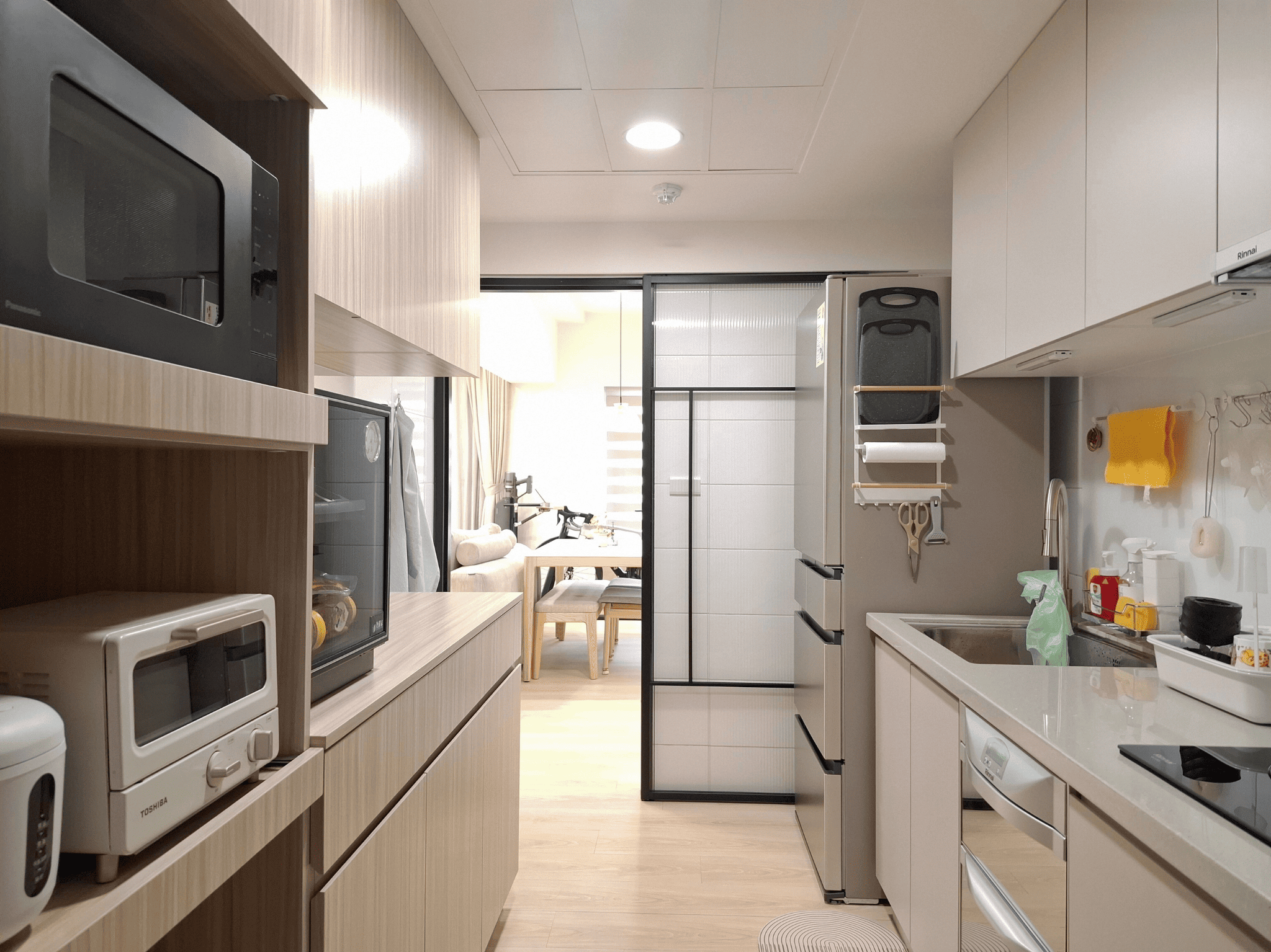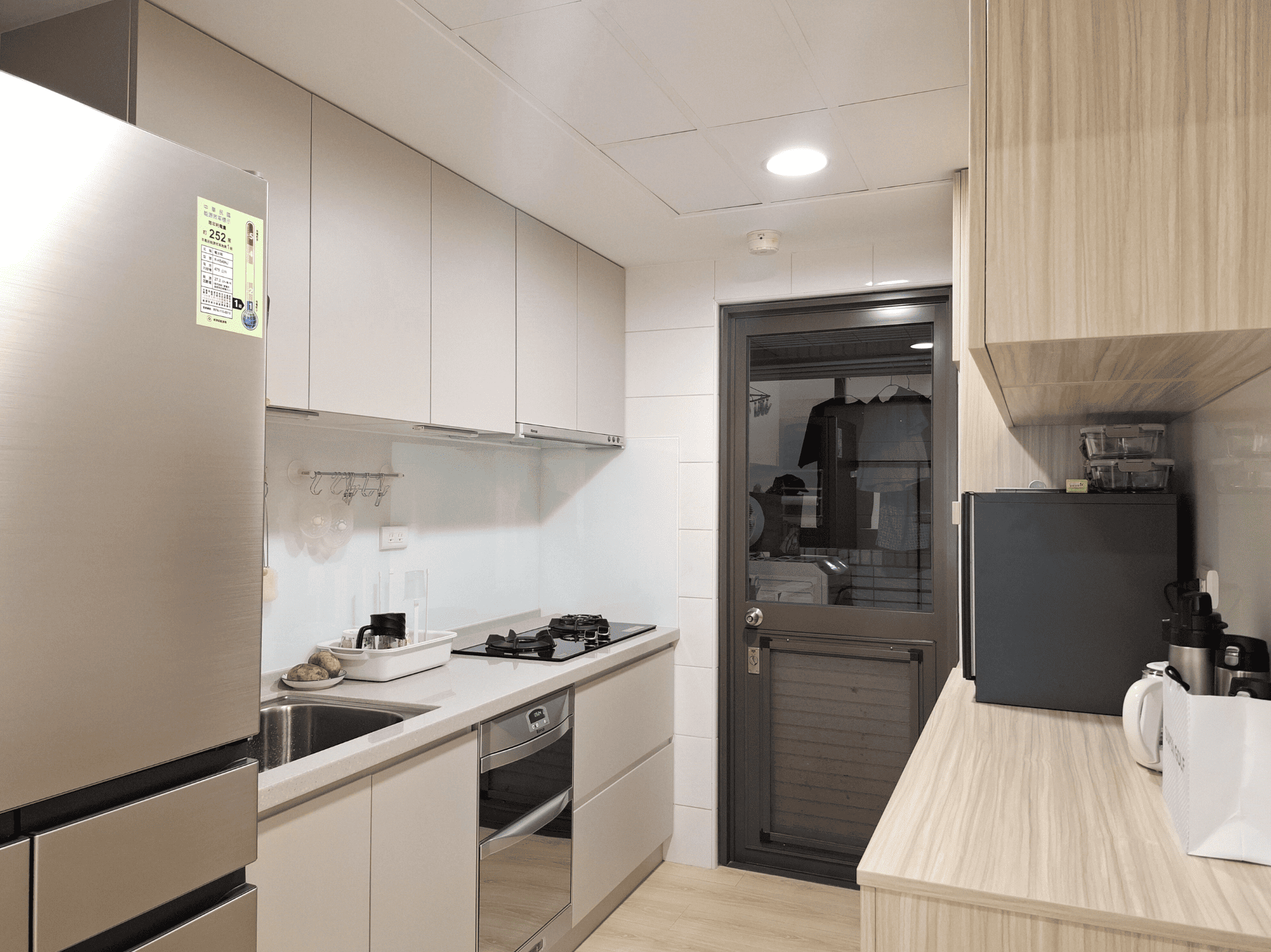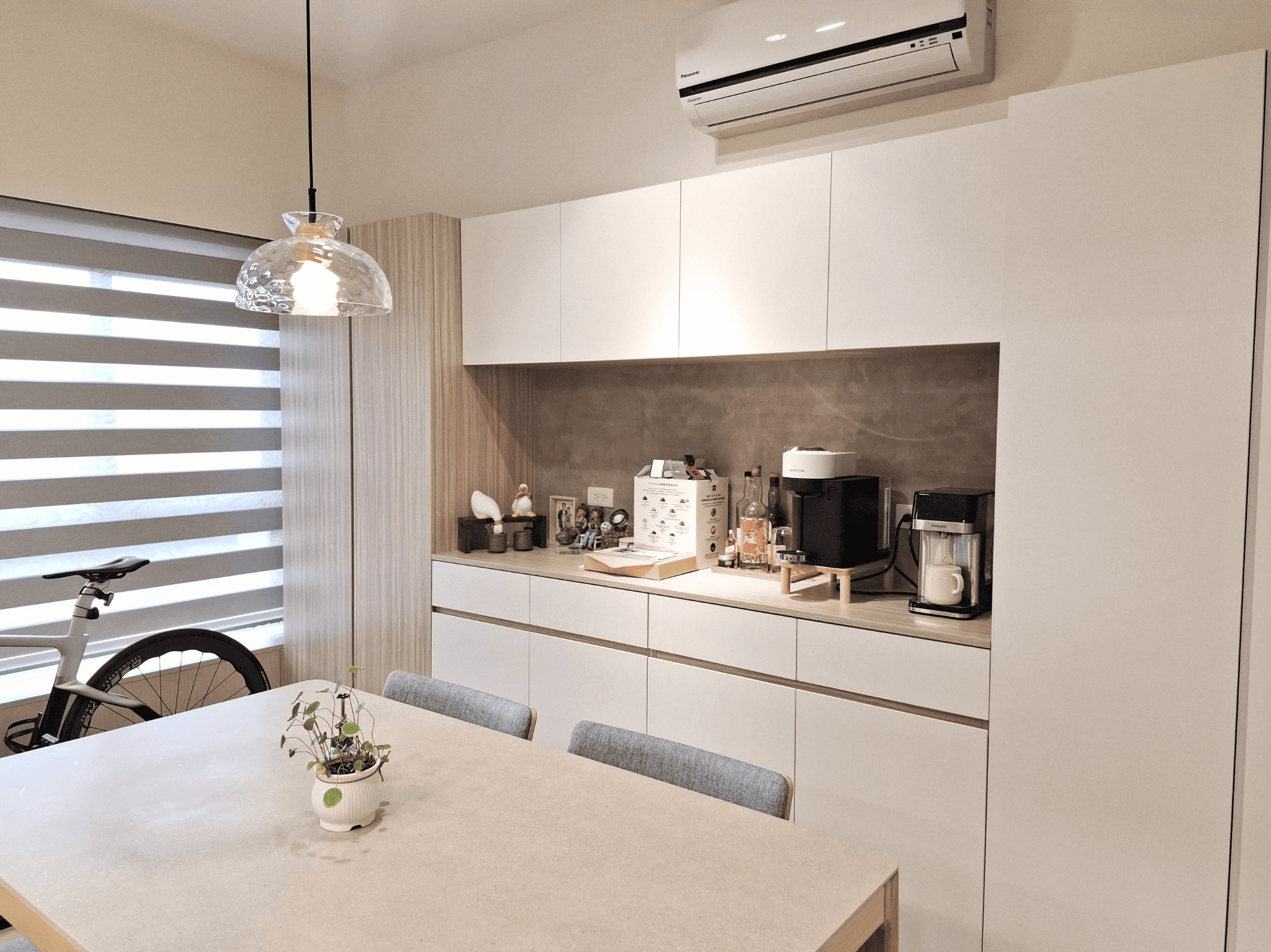 空間採現代簡約設計,整體以白色基調結合淺木紋材質,形塑出明亮清新的視覺印象。客餐廳採開放式格局,動線銜接自然,使空間更顯通透。地坪選用淺色木紋地板,延續整體風格一致性,搭配垂直面的大量收納櫃體,兼具美觀與機能。