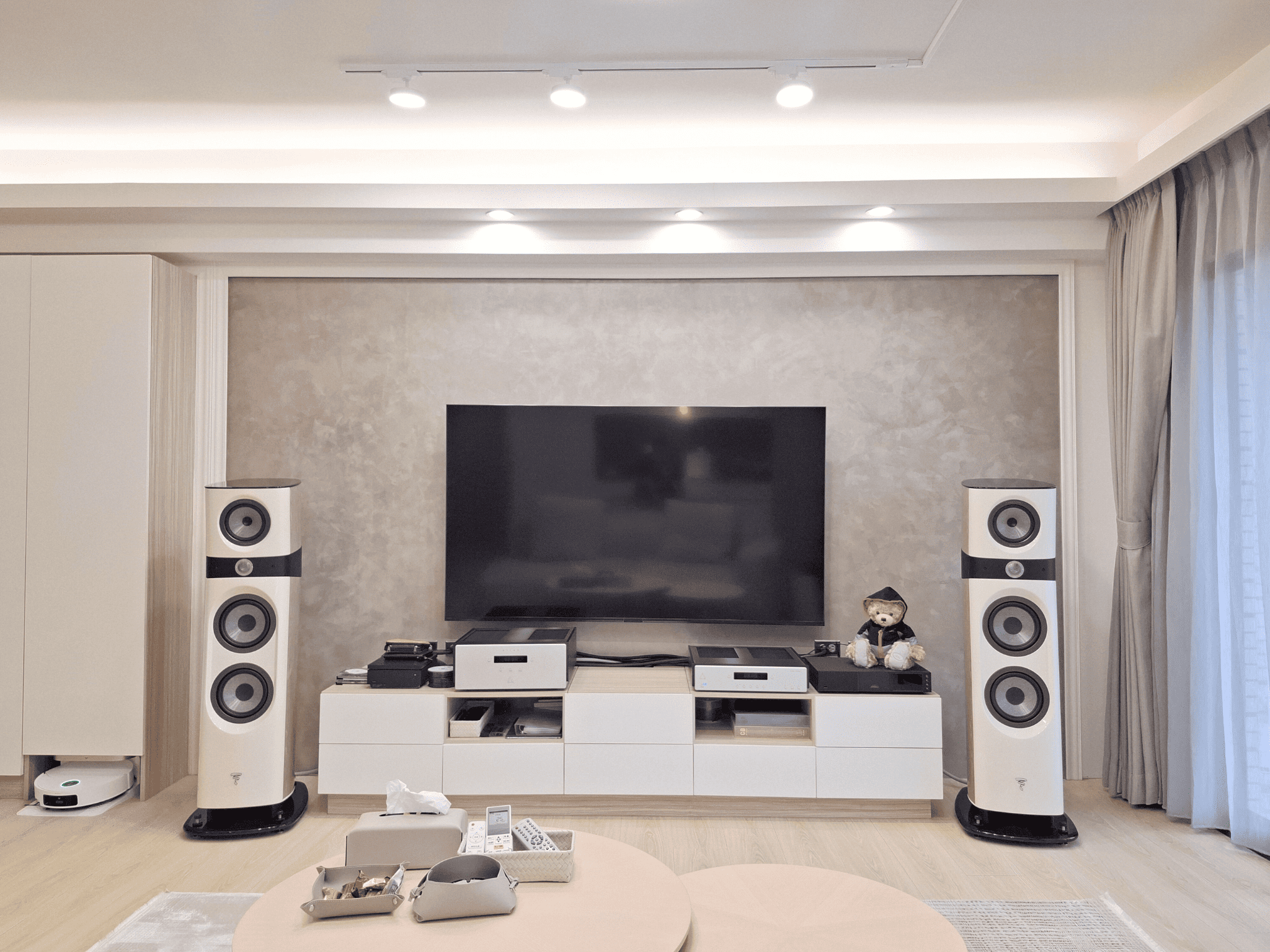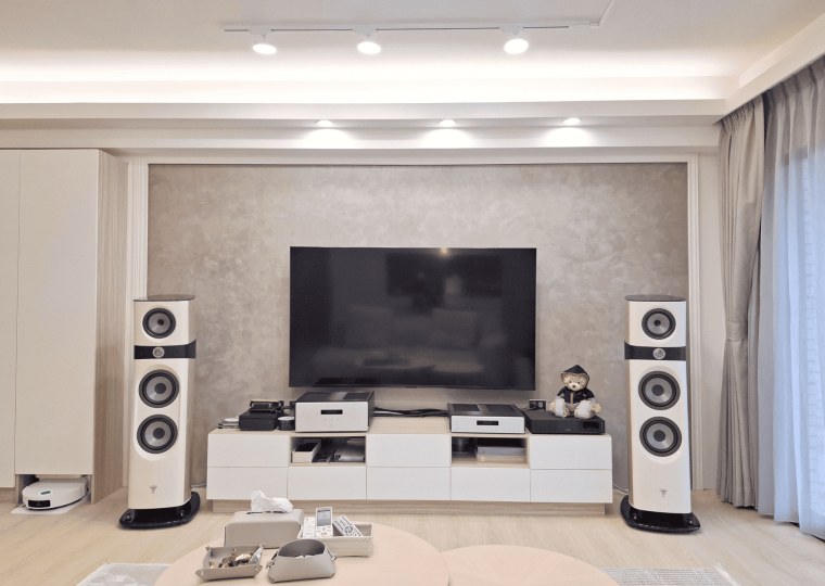 家具配置強調輕量與柔和曲線,米白布料與原木扶手的餐椅,強化空間的溫潤調性。電視主牆選用異材質拼接,局部導入弧形轉角與間接光源,增添立面層次,亦柔化整體視覺。