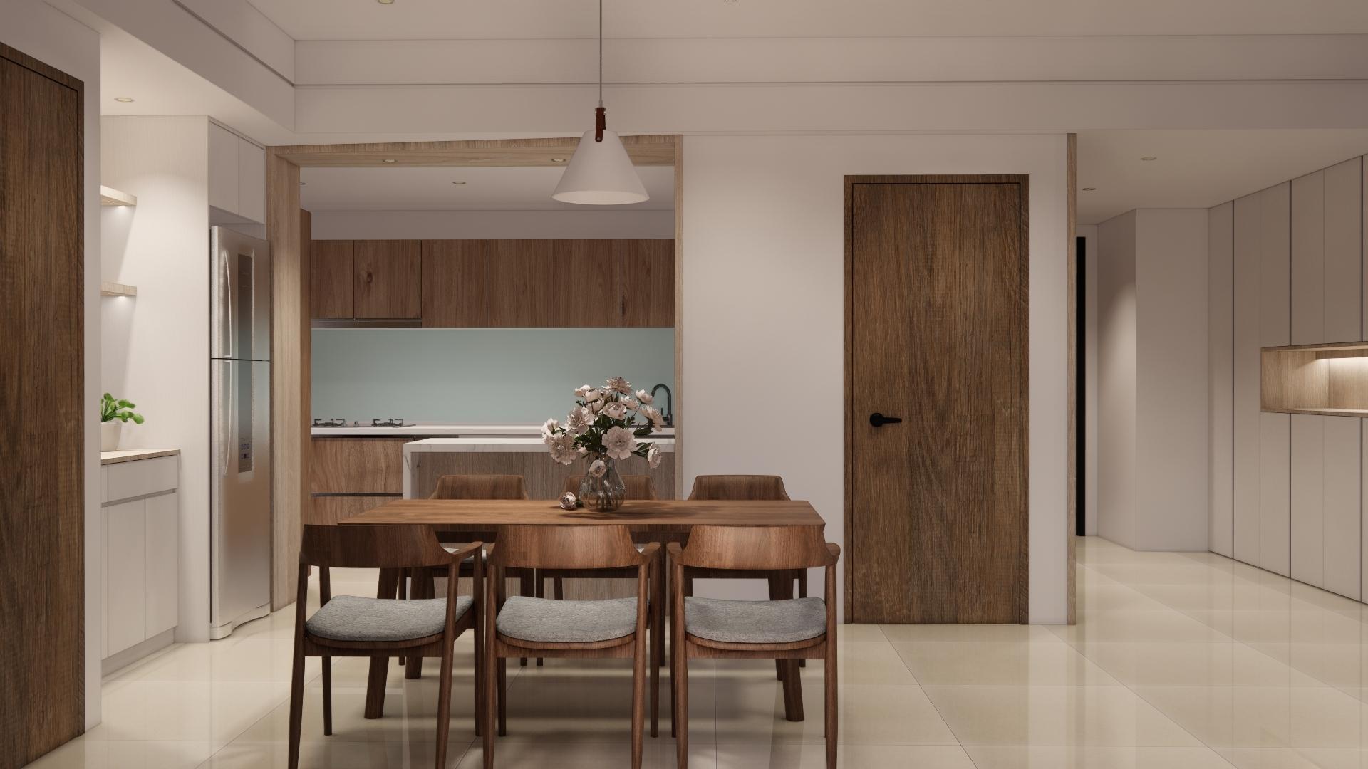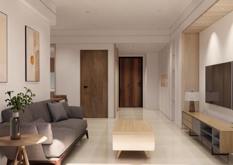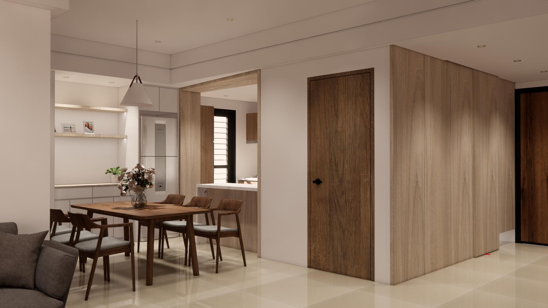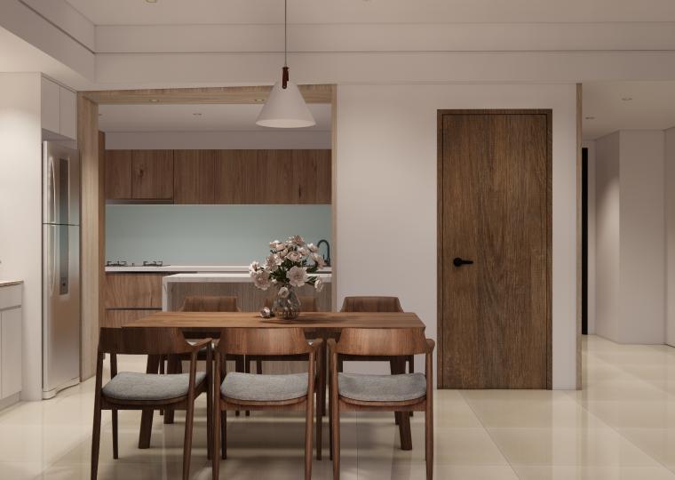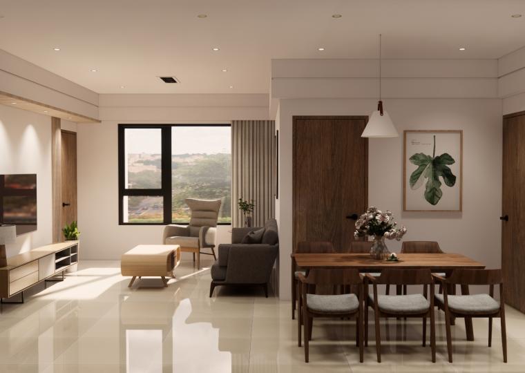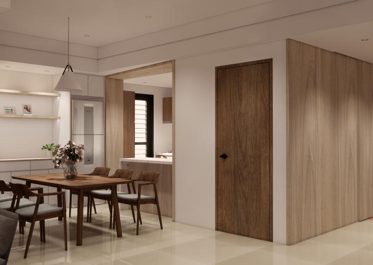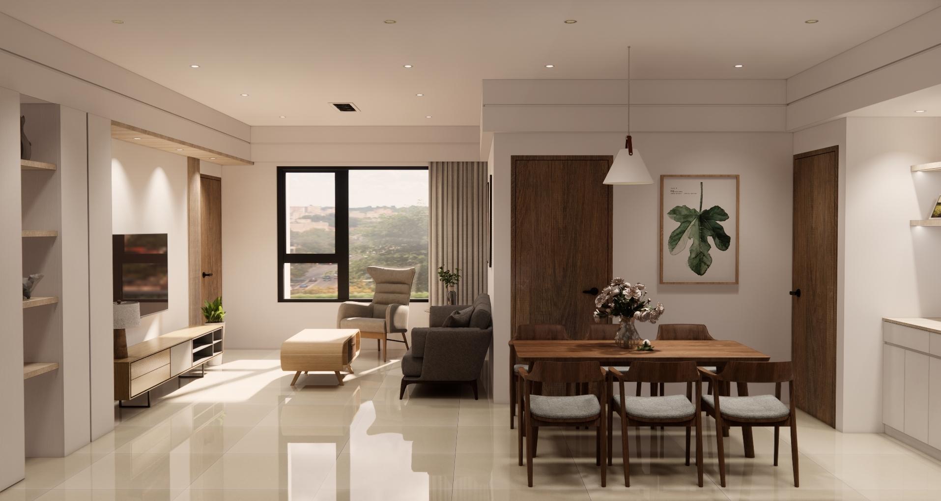 空間以白色基底搭配溫潤木質,營造出柔和、溫暖又不失現代感的居家氛圍。 線條俐落的家具與自然光交織,讓空間更顯通透與寬敞。無過度裝飾,卻在細節中展現品味:從掛畫、燈飾到植栽,每一處都蘊含著精心安排。餐廳與客廳串連,視覺延伸性極佳,營造出生活與美學融合的節奏感。 灰色沙發與木質餐桌椅相互呼應,低彩度配色使整體更顯寧靜舒適。這是一個適合靜下心來,細細品味生活的居所。