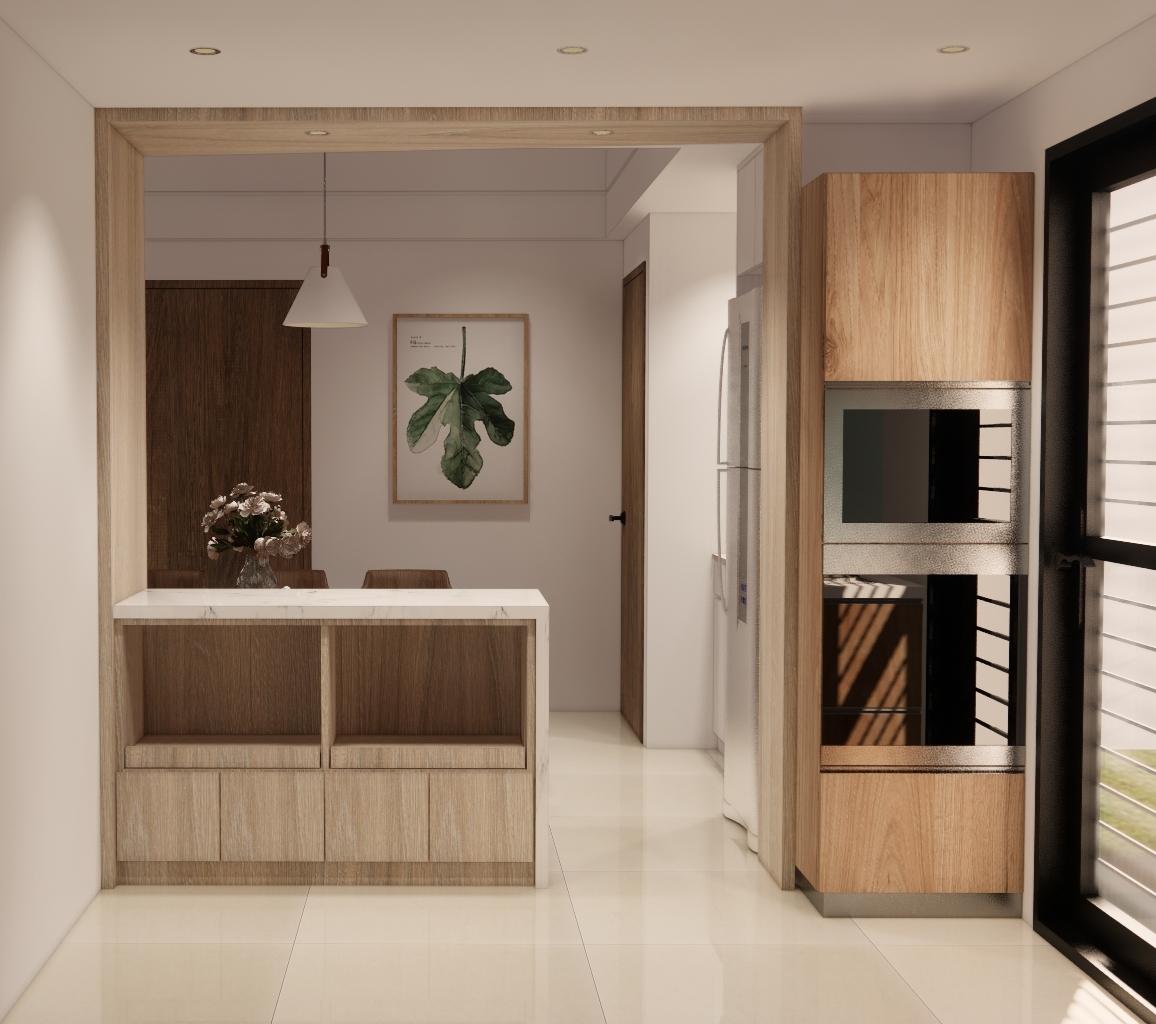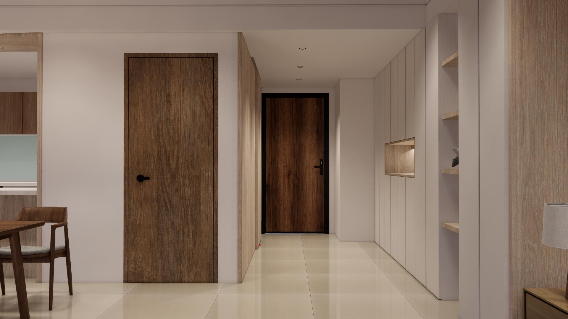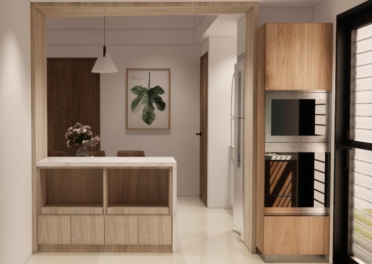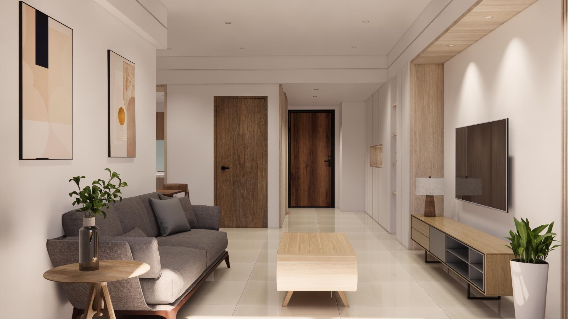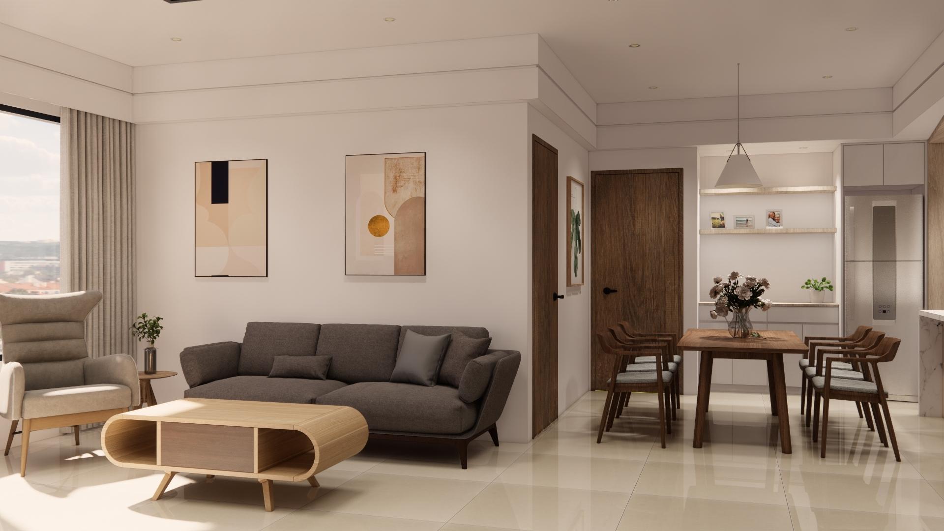 空間以白色基底搭配溫潤木質,營造出柔和、溫暖又不失現代感的居家氛圍。 線條俐落的家具與自然光交織,讓空間更顯通透與寬敞。無過度裝飾,卻在細節中展現品味:從掛畫、燈飾到植栽,每一處都蘊含著精心安排。餐廳與客廳串連,視覺延伸性極佳,營造出生活與美學融合的節奏感。 灰色沙發與木質餐桌椅相互呼應,低彩度配色使整體更顯寧靜舒適。這是一個適合靜下心來,細細品味生活的居所。