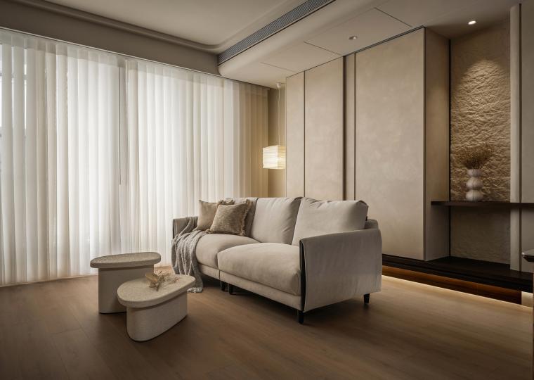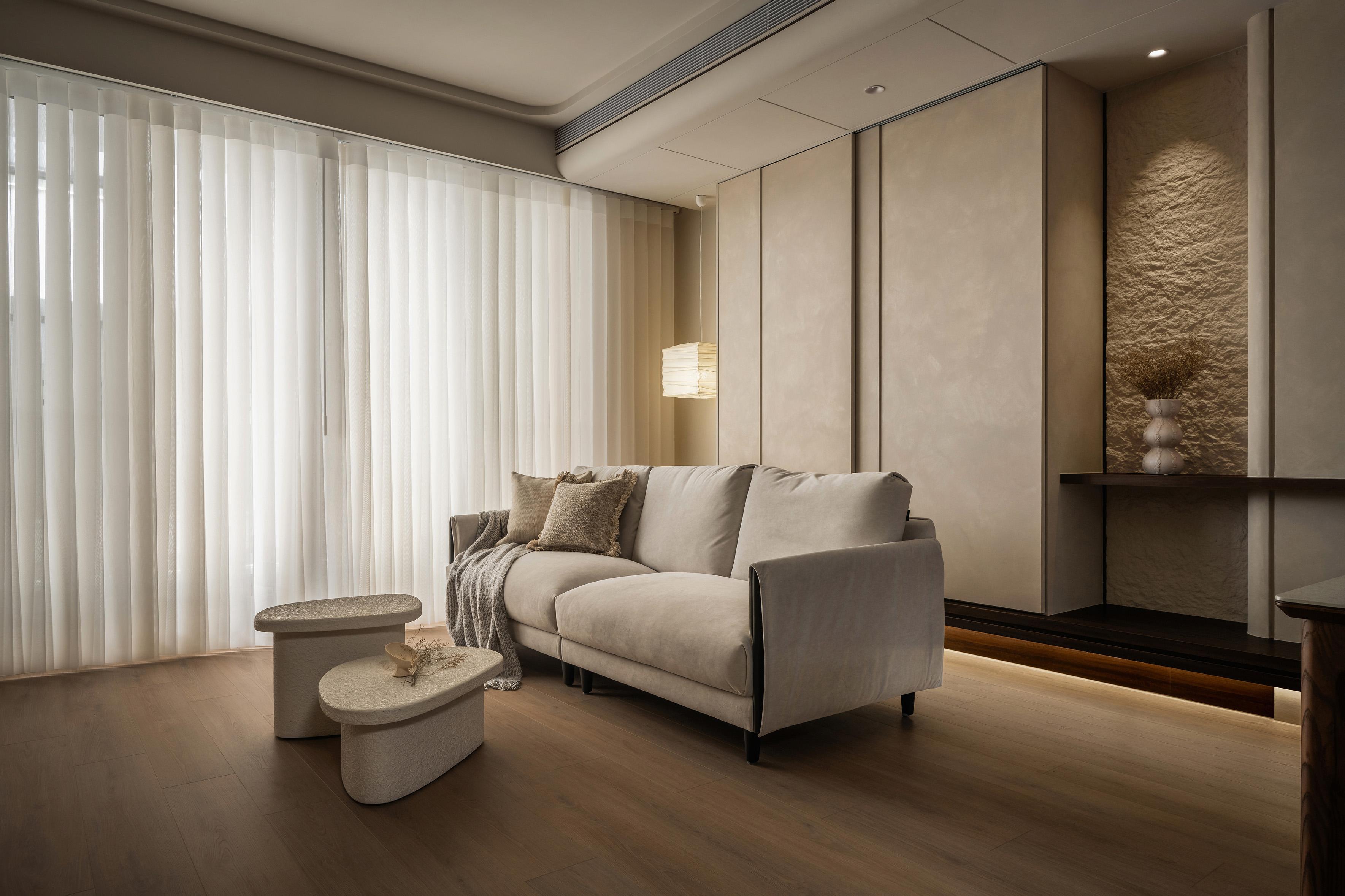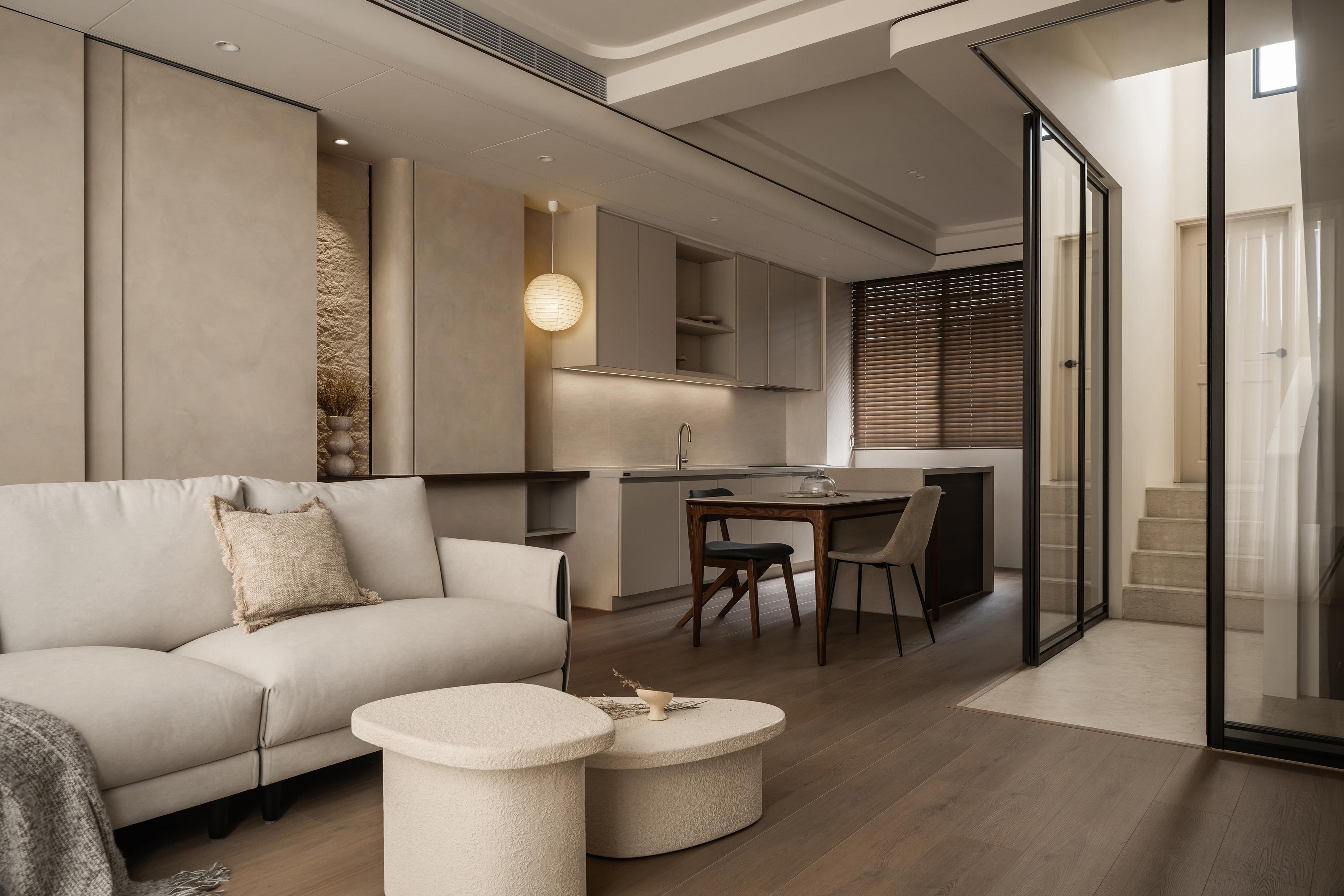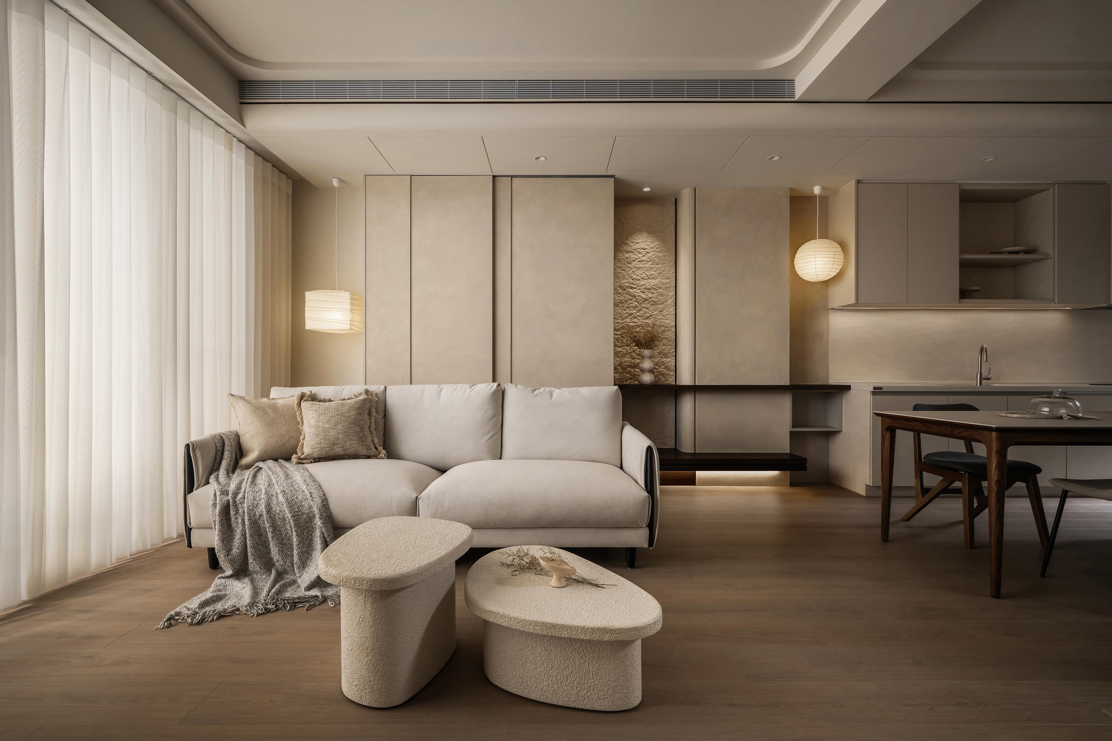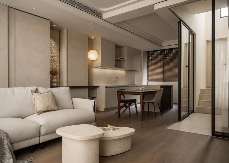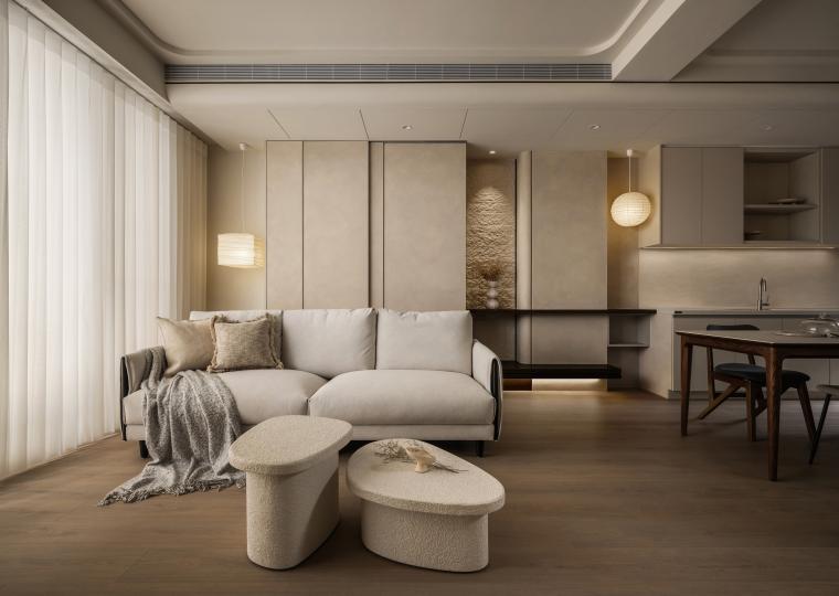 本案以暖色調打造主要生活空間,搭配實木層板及深色木皮形塑空間層次感。