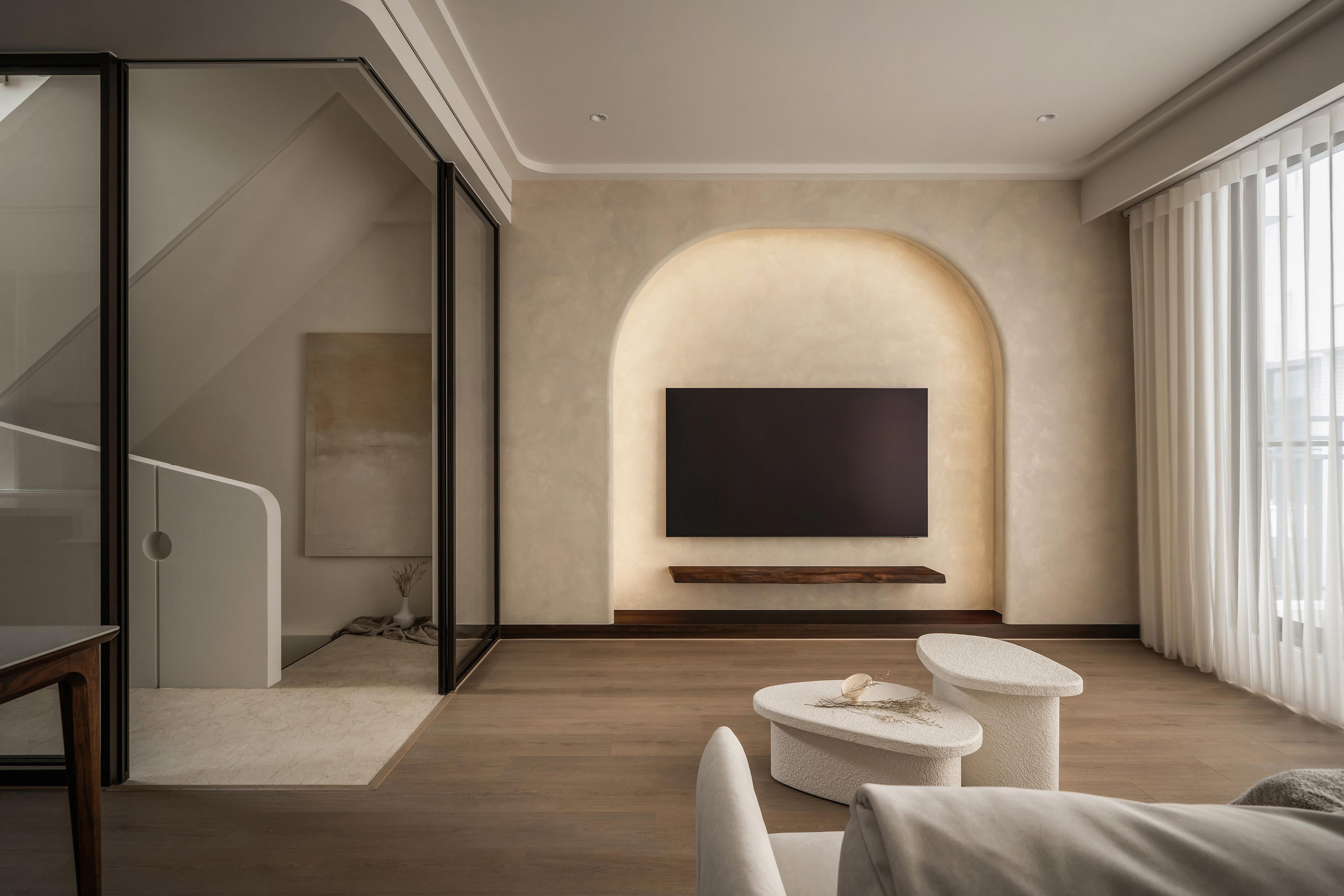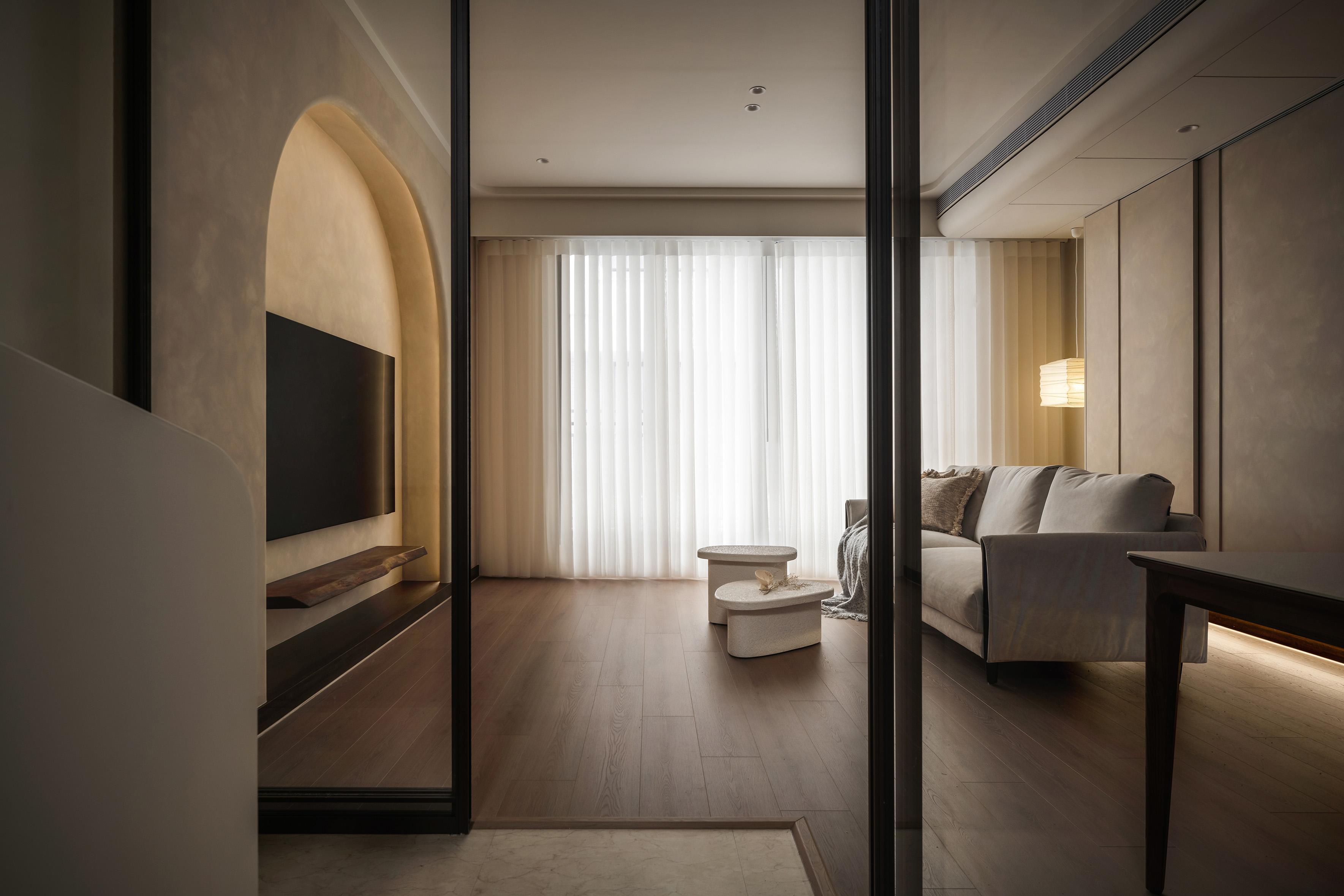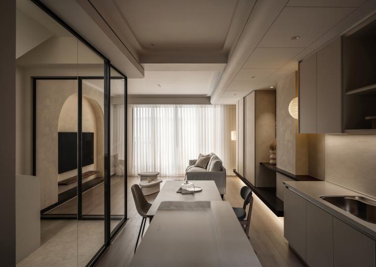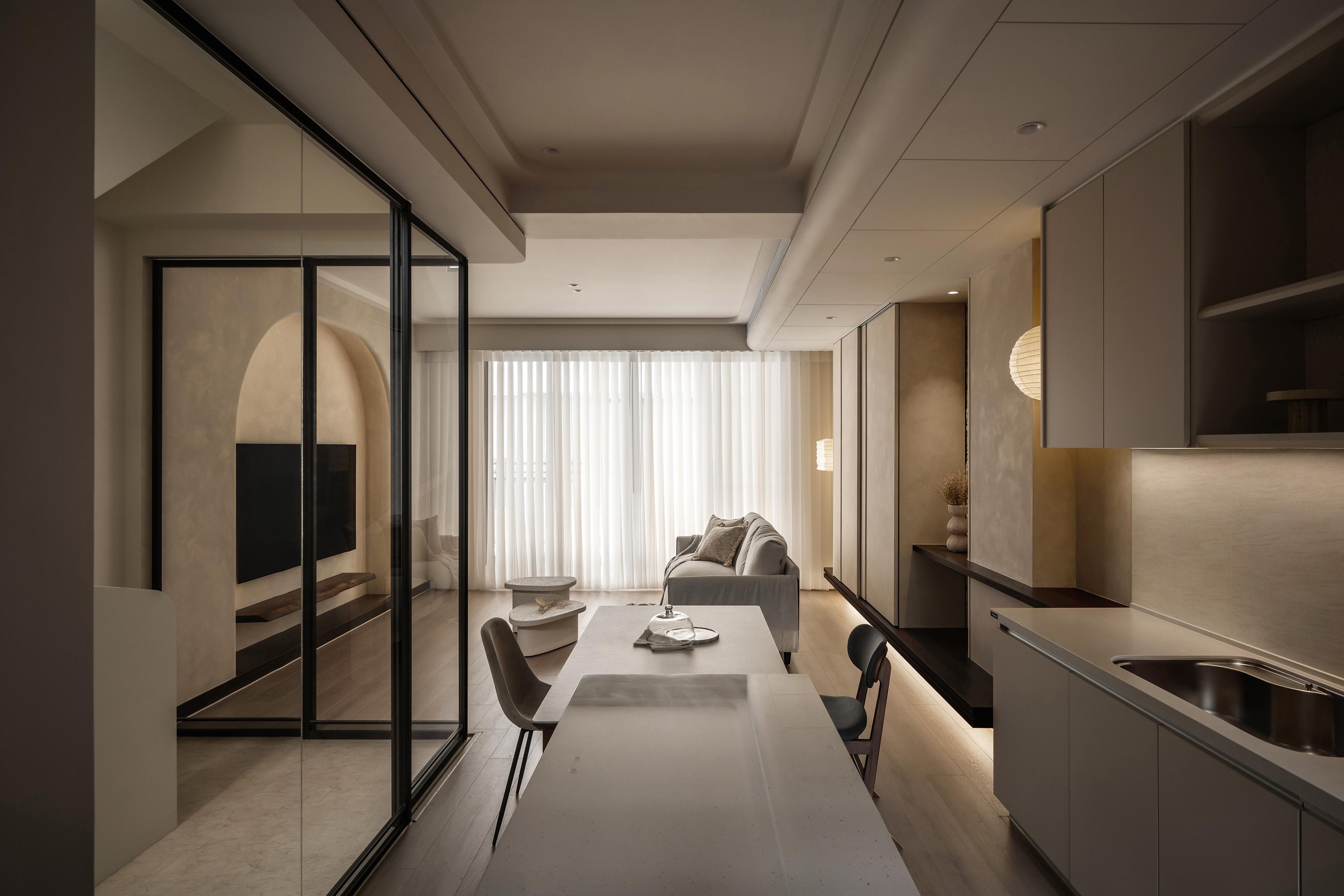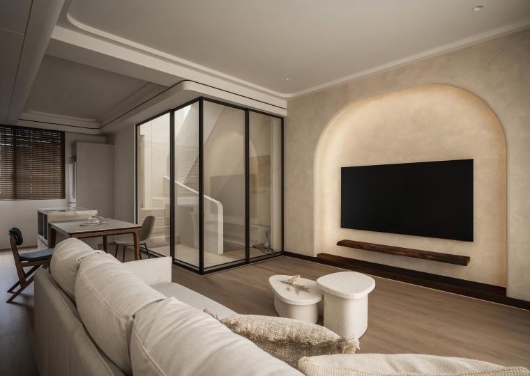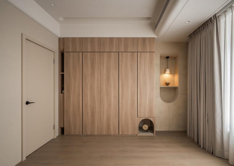 本案以暖色調打造主要生活空間,搭配實木層板及深色木皮形塑空間層次感。