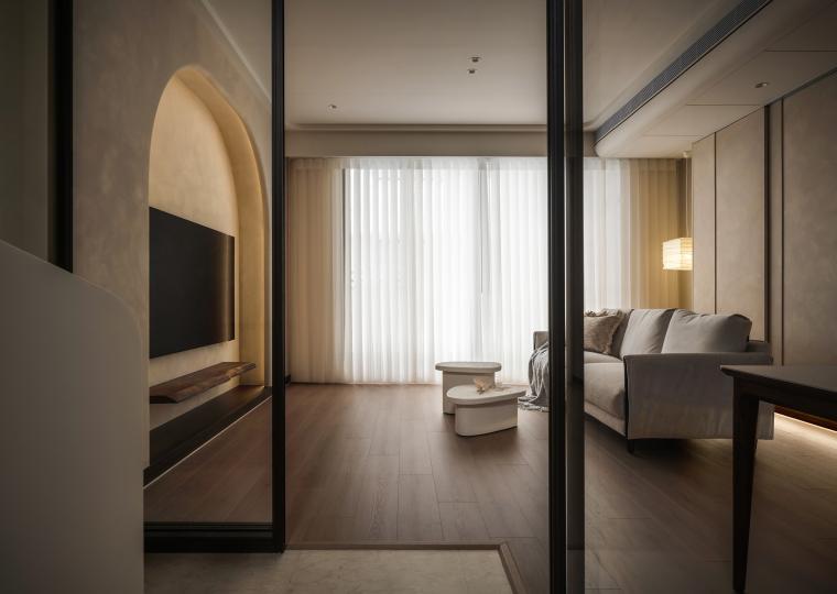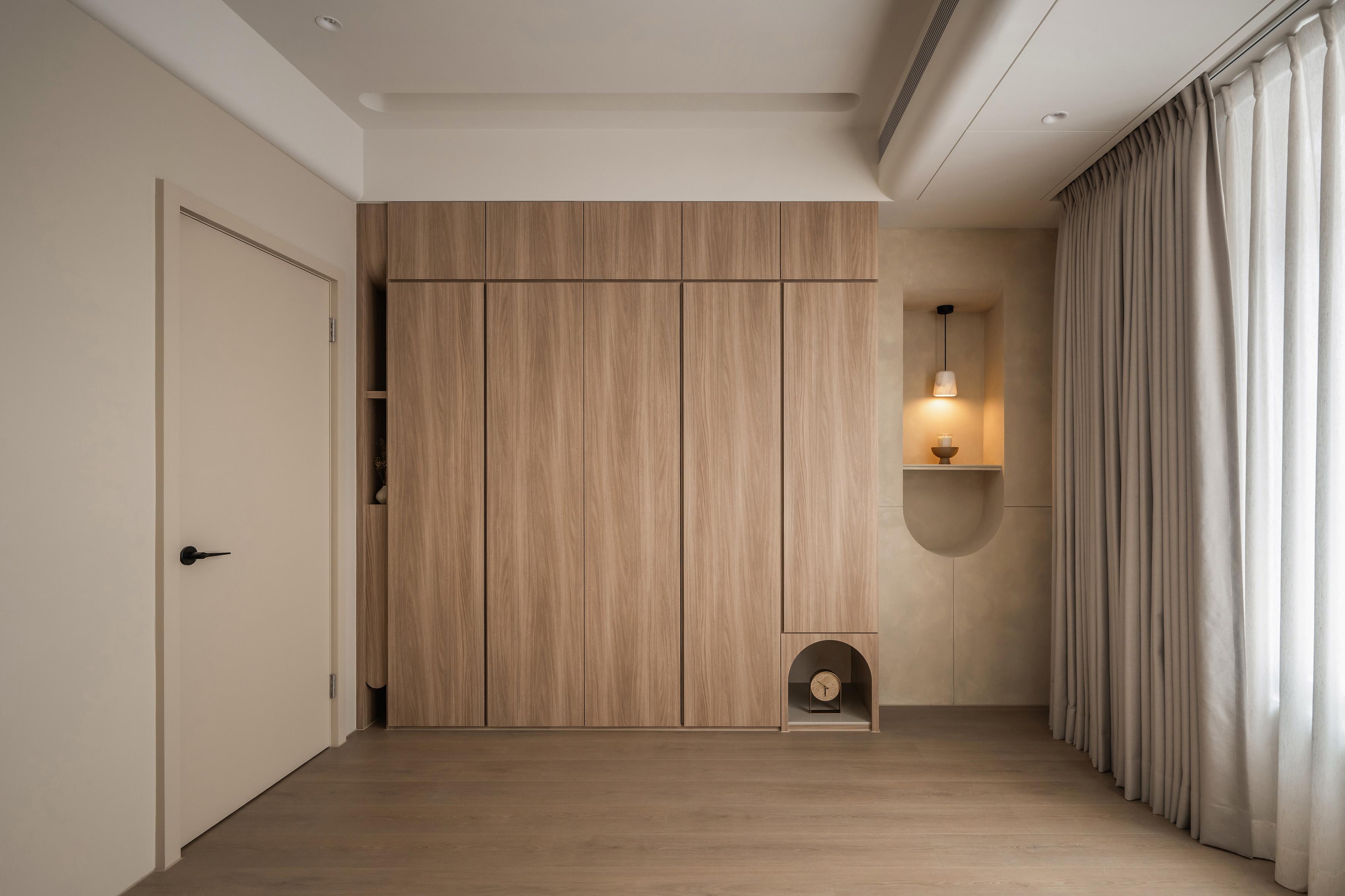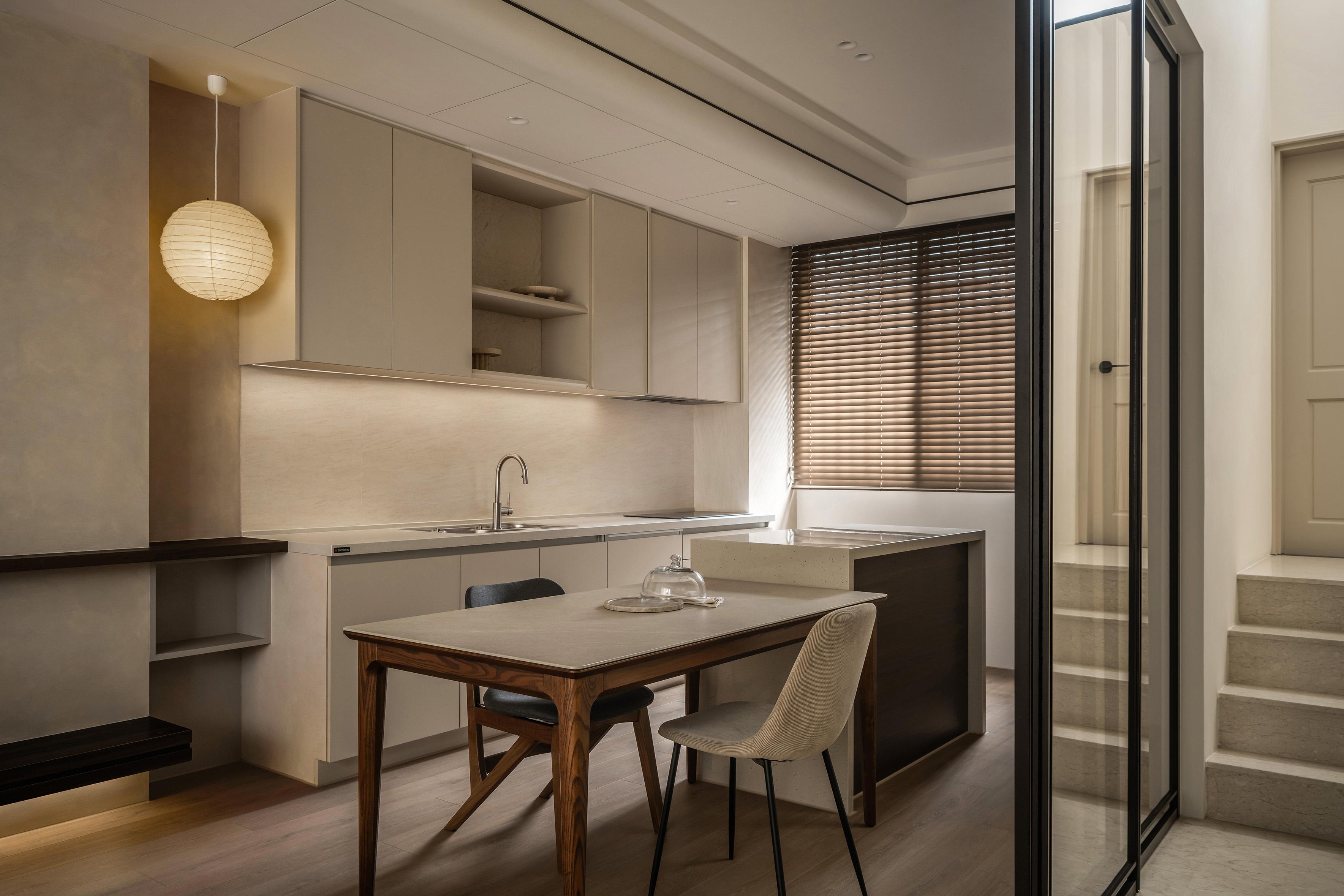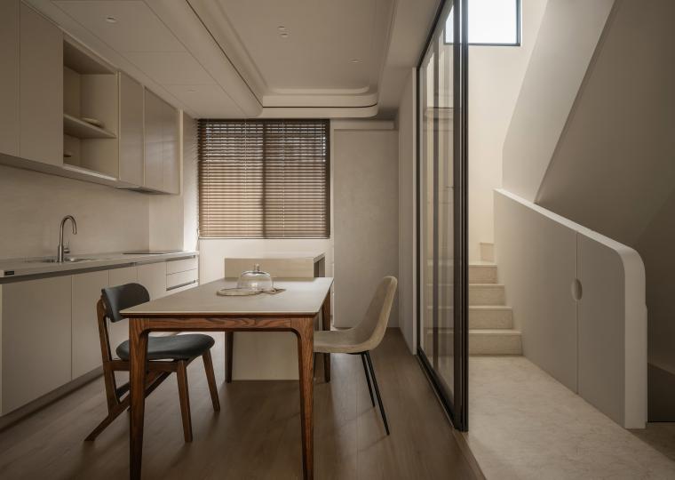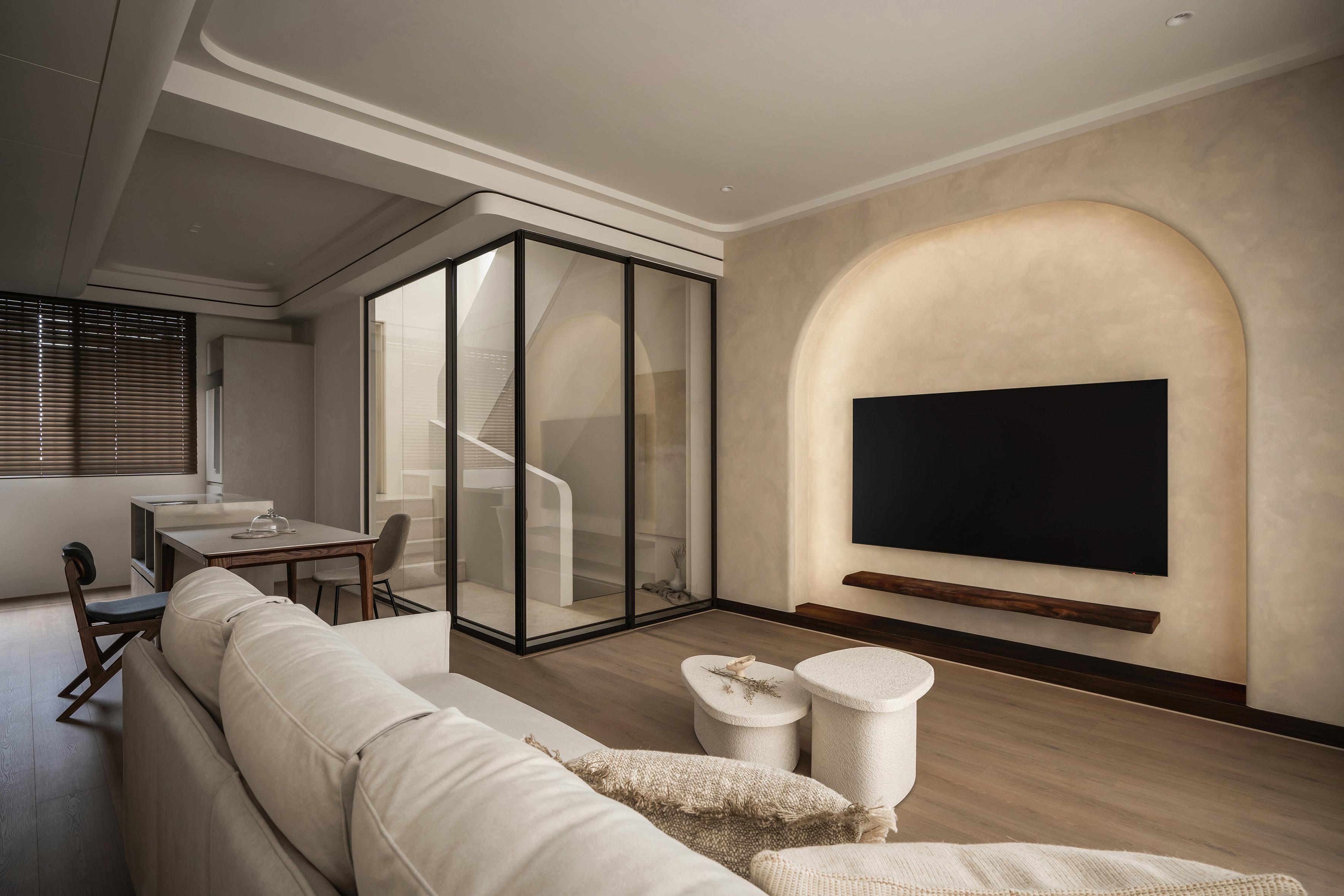 本案以暖色調打造主要生活空間,搭配實木層板及深色木皮形塑空間層次感。